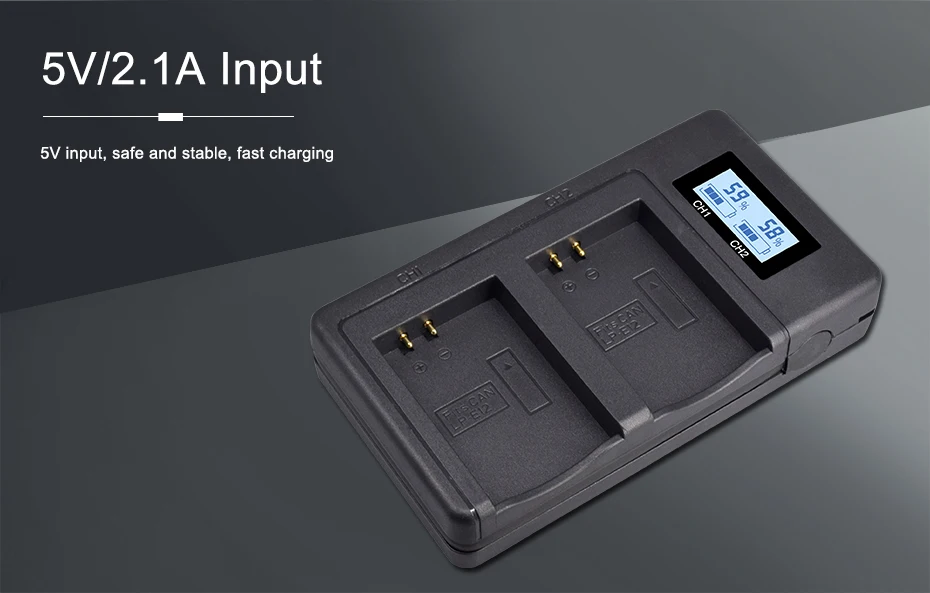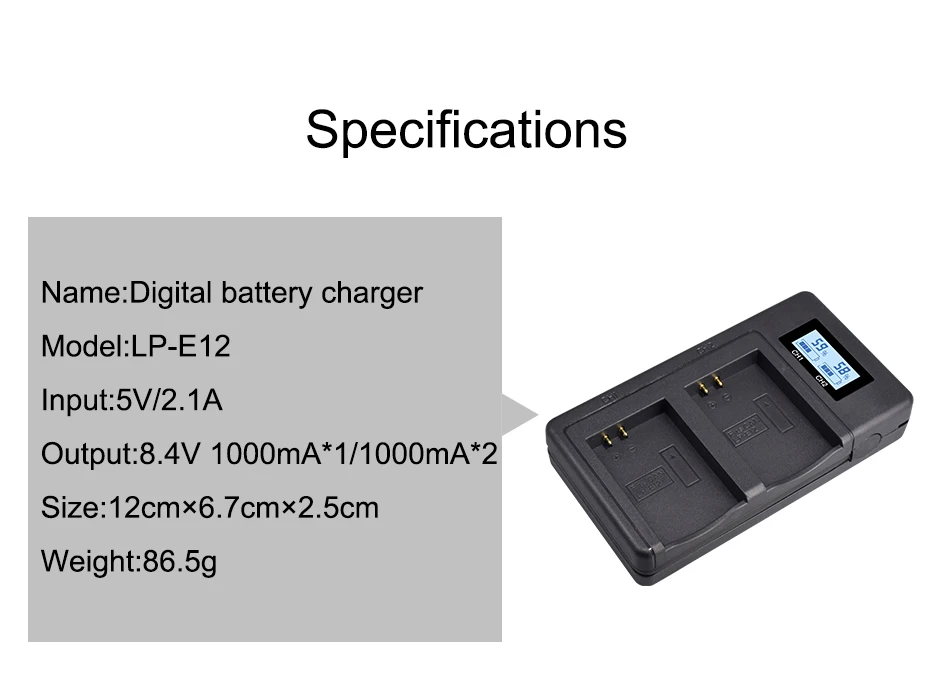Режим: USB умное быстрое зарядное устройство для LP-E12Вход: 5 В/2,1 АВыход: 8,4 в 1000мА * 2 батареиРазмер: 120 мм * 67 мм * 25 ммВес: 86,5 г