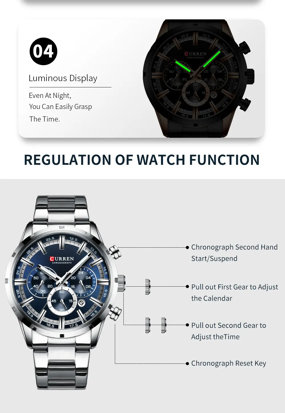 CURREN Мужские часы Топ люксовый бренд Спортивные кварцевые мужские s часы полностью стальные водонепроницаемые наручные часы с хронографом мужские часы