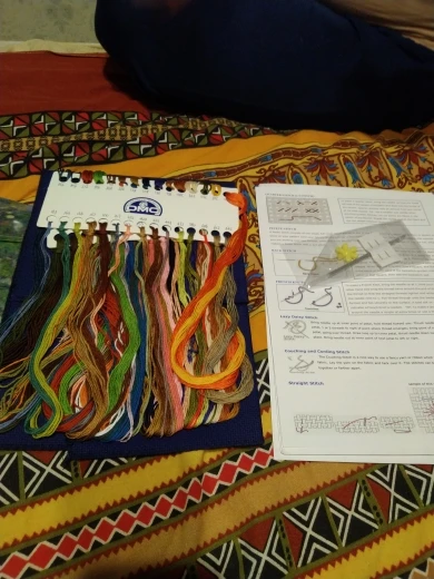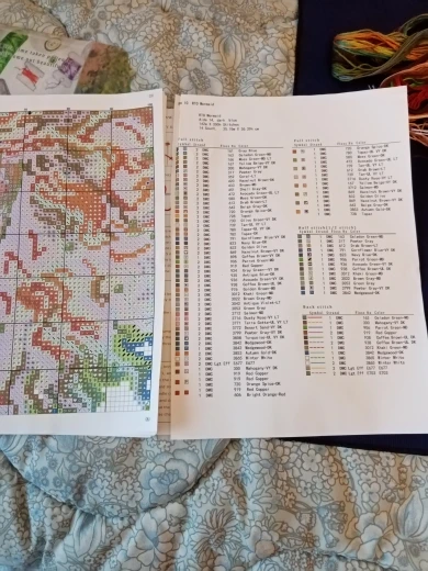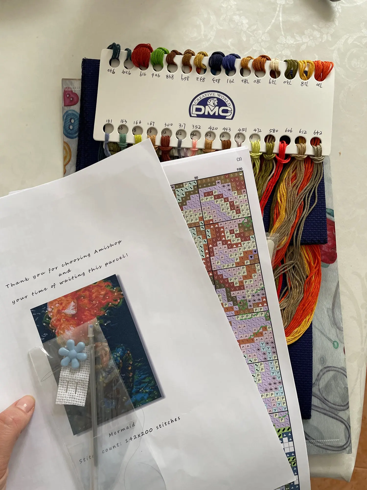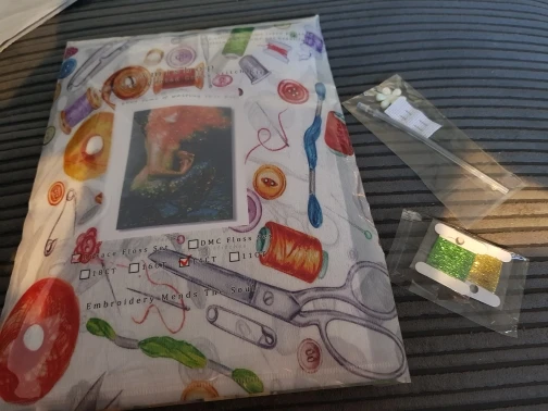Посылка не повреждена. Вышивка упакована в красивую папку. Схема супер крупная. сколько заказывала раньше мелковато было. здесь формат А4 крупно четко ярко на отдельных листах. канва оверложена. 46цветов ниток+ 2цвета блистящих. 2 иглы и стержень с блистящим стернем. уже проверила супер))