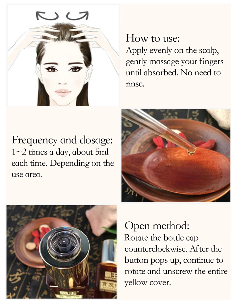Правильное использование, для быстрого роста волос.Как использовать:Нанесите равномерно на кожу головы, аккуратно массируйте пальцы до впитывания. Не нужно краску.Частота и дозировка: 1-2 раза в день, около 5 мл каждый раз. В зависимости от площади использования.Метод открытия: поверните крышку бутылки против часовой стрелки. После того, как кнопка всплывает, продолжайте вращать и откручивать всю желтую крышку.Высокая популярность, высокая репутация и важное значение для позднего времени.Поверхность кожи к волосяным фолликулам, осмотическое обслуживание. Предотвращает выпадение волос, волосы.Особенности:Движение назад; Для роста волос, способствует густому росту волос.