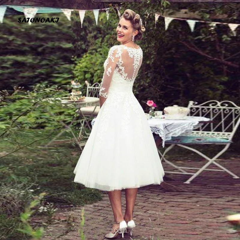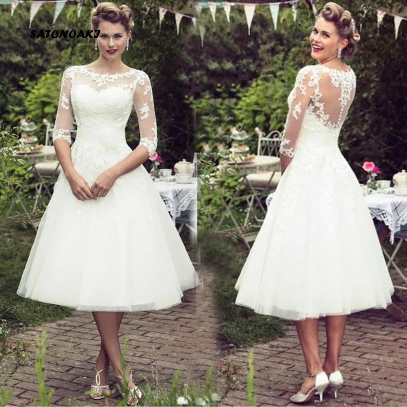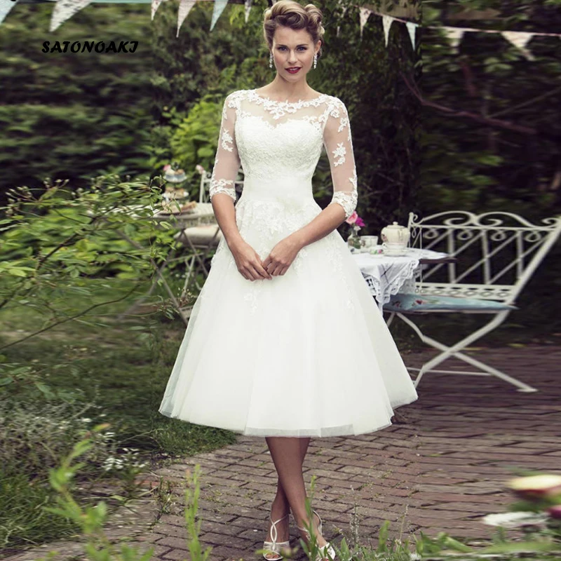 Женское кружевное свадебное платье It's yiiya, белое короткое платье до середины икры с рукавами до локтей на лето 2019