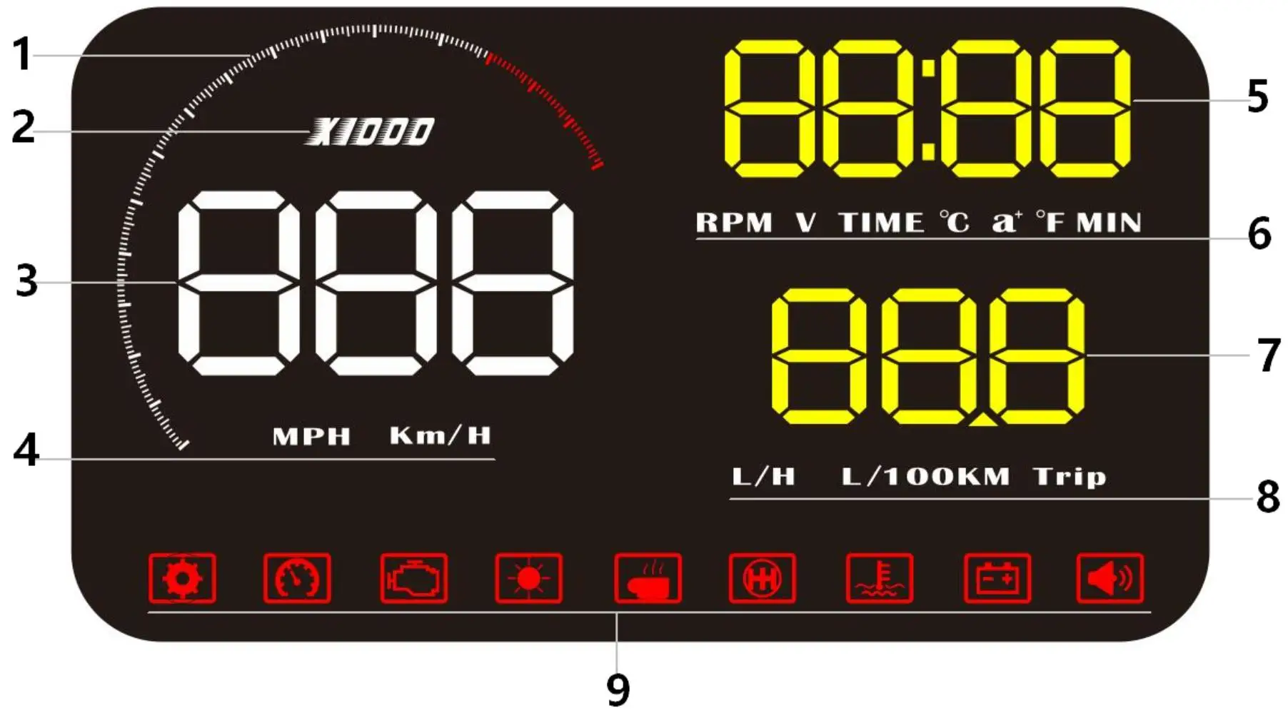 1. Декоративный светильник 2. Двигатель об/мин 3. Скорость 4. Блок скорости (км/ч, миль/ч) 5. Многофункциональная область 1: двигатель об/мин, напряжение, часы, время одиночного вождения (мин), температура воды (℃/°F), время ускорения 100 км (a +) 6. Блок для многофункциональной области 1 7. Многофункциональная область 2: расход топлива, расстояние поездки 8. Блок для многофункциональной области 2 9. Значок: Настройка, превышение скорости сигнализации, код неисправности, датчик на светильник, сигнализация на усталость, переключение напоминания, сигнализация на температуру воды, Сигнализация низкого напряжения, звуковой сигнал