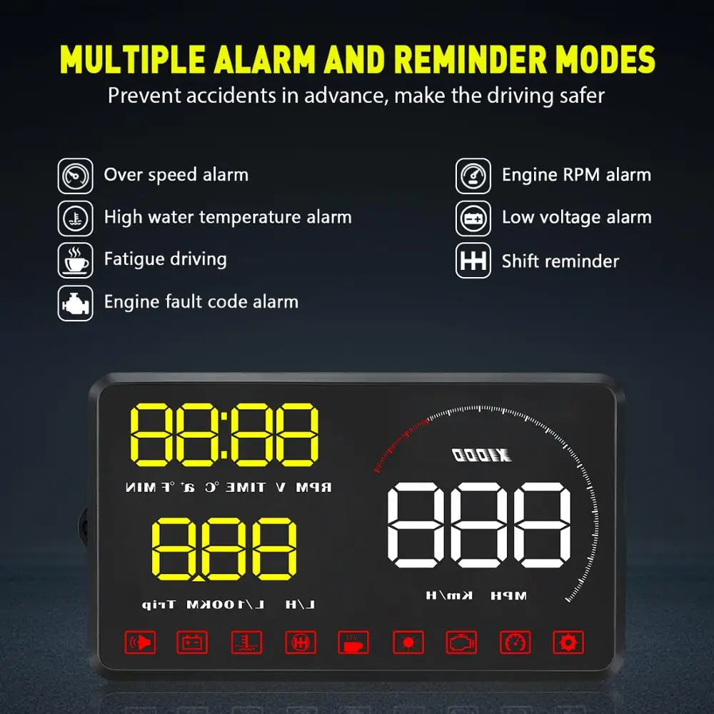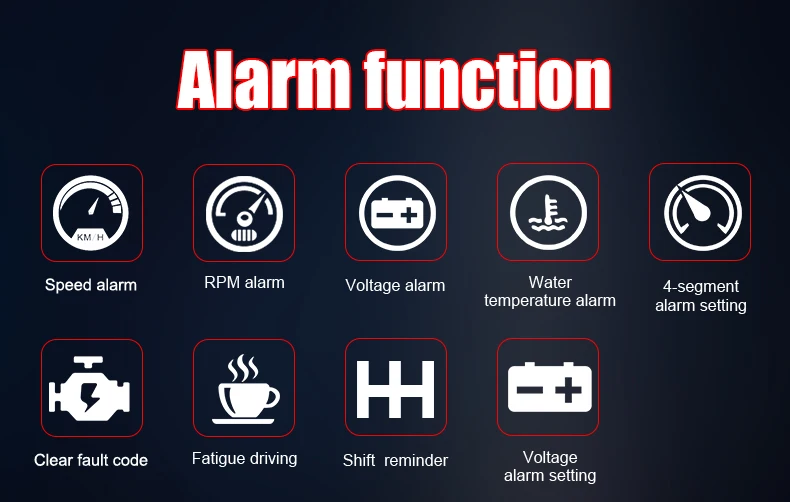 6. Богатое содержание: скорость, об/мин, температура воды, напряжение, мгновенный расход топлива, средний расход топлива, измерение расстояния вождения, напряжение, напоминания о смене, напоминания о усталости вождения, Сигнализация низкого напряжения, сигнализация с высокой температурой воды, сигнализация с превышением скорости, сигнализация неисправности двигателя, устранение кода неисправности, свободное переключение между километрами и милями.