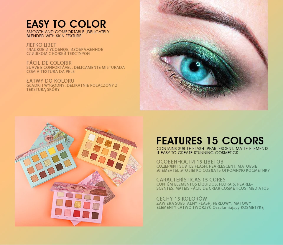 15 потрясающих оттенков для выразительности глаз. Шикарная палетка теней, с разнообразными цветами. Зеркало в комплекте, что удобно при использовании. Доставка всего 4 дня со склада в России! Я довольна. Рекомендовать могу.