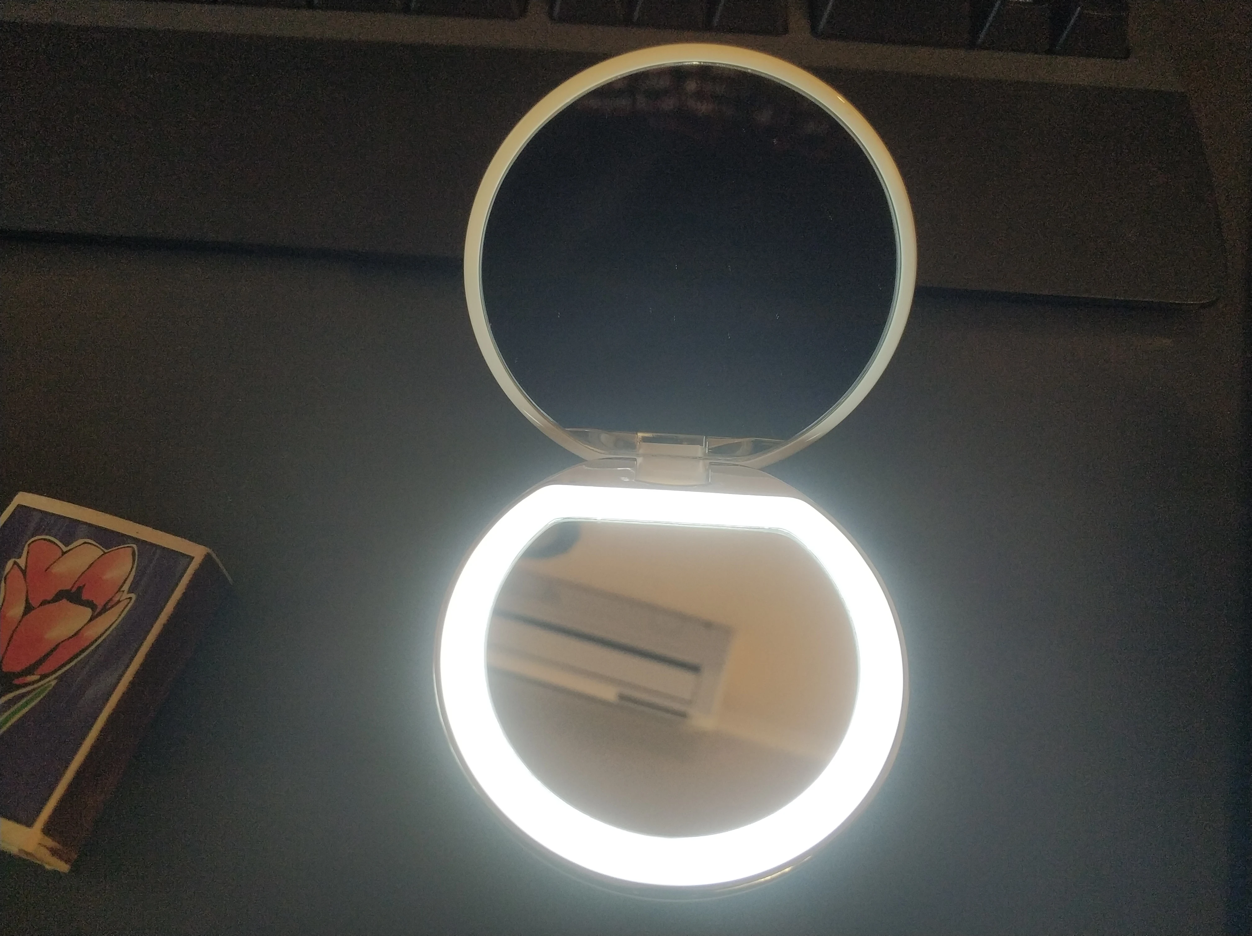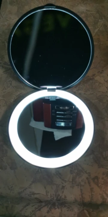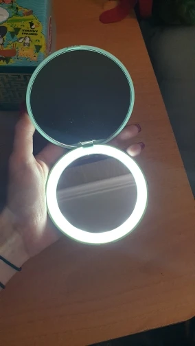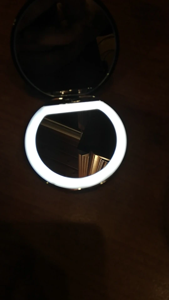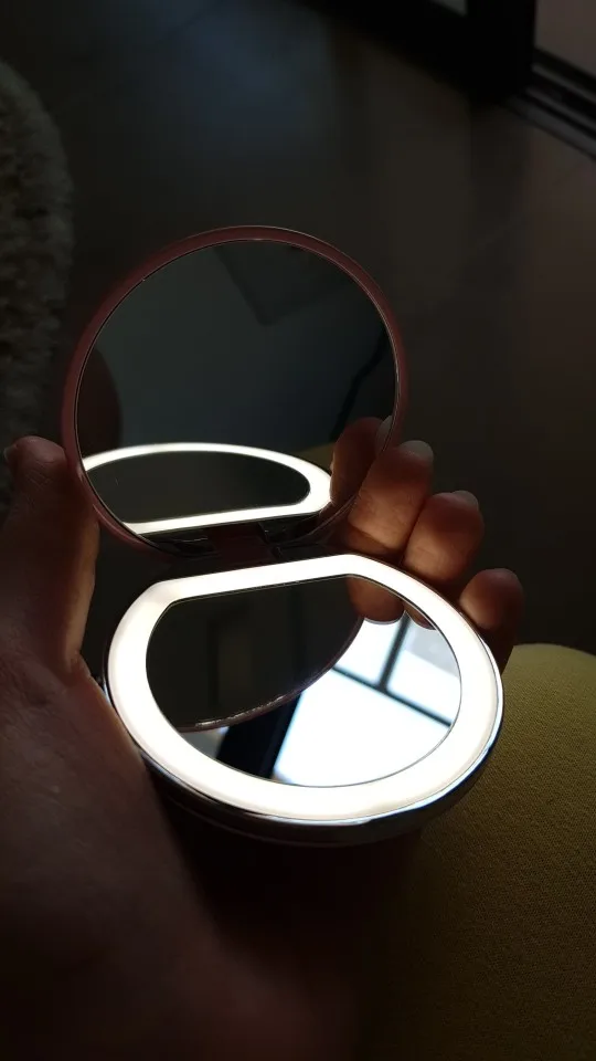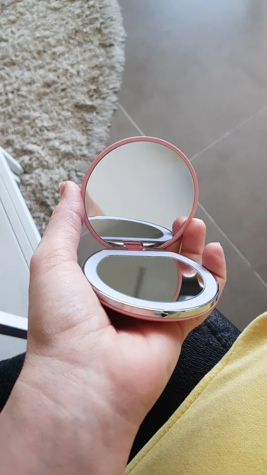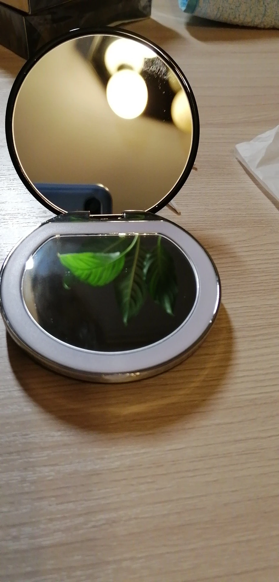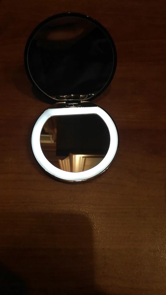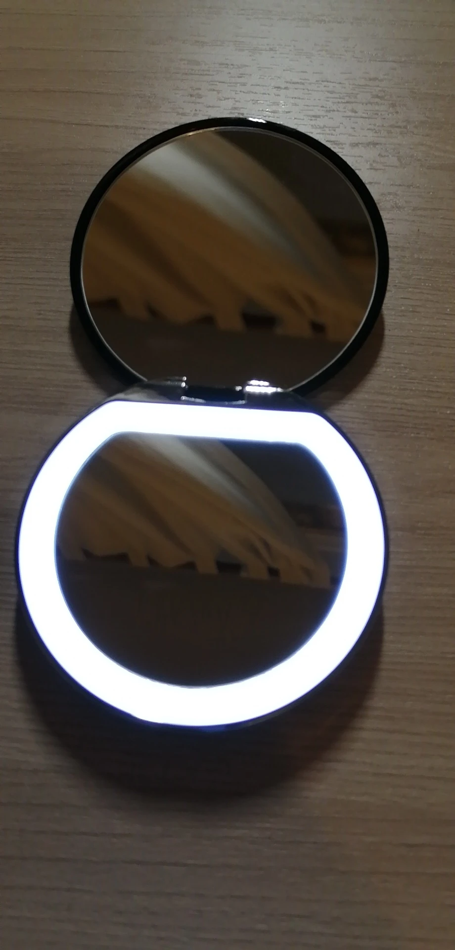 Товар пришел очень быстро! Я так доволен этим, внутри есть два зеркала: зеркало с светом отражается в истинном размере, один без света немного увеличивается. Он поставляется с зарядным кабелем и имеет 3 различных интенсивности света, вы можете изменить свет, нажав маленькую кнопку на боковой стороне зеркала. Очень легкий и не слишком толстый, я думаю, что это идеально!