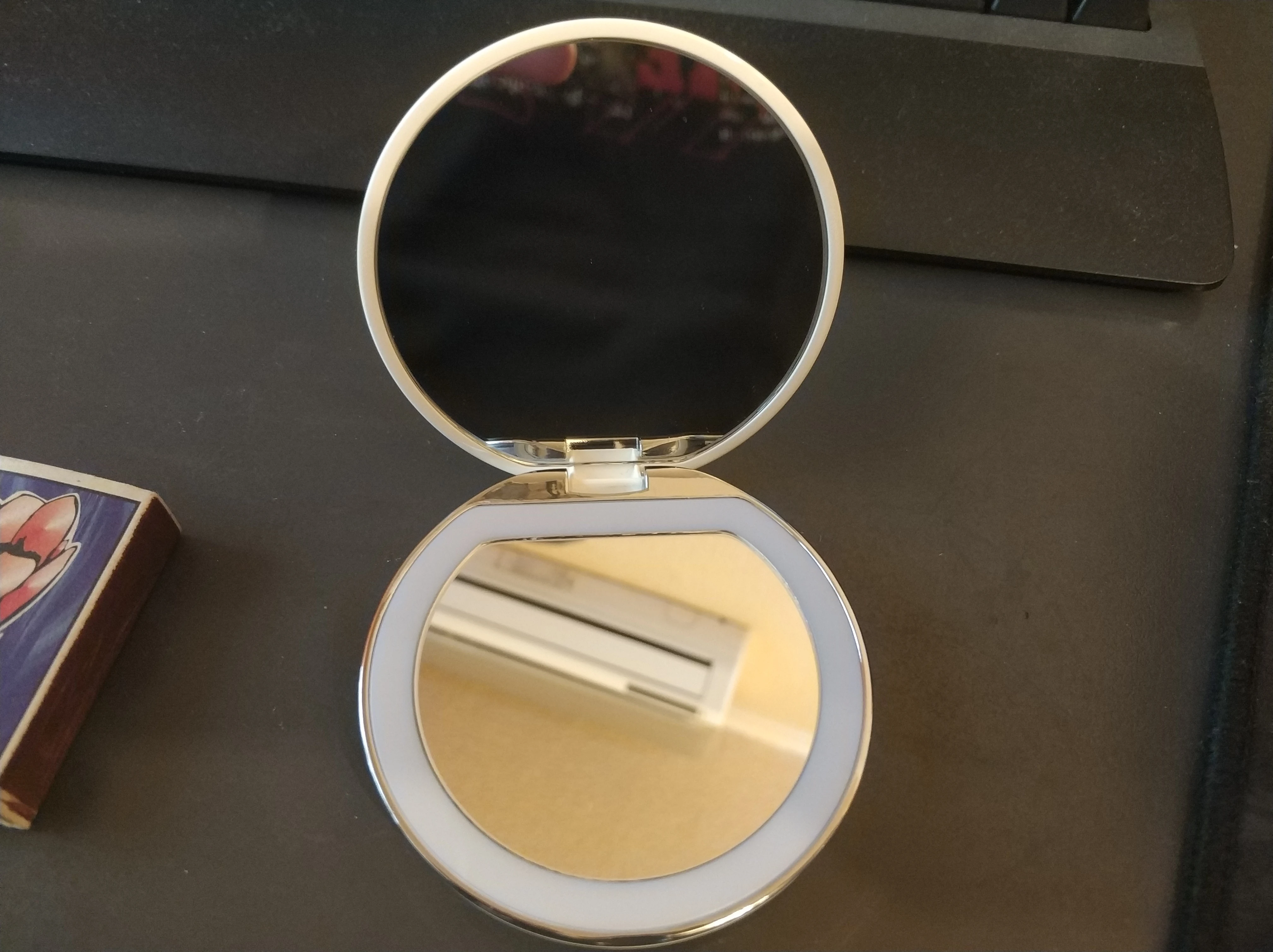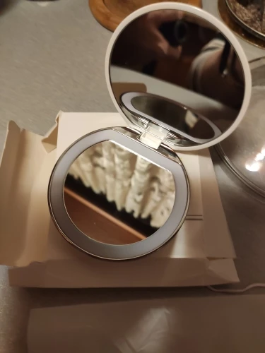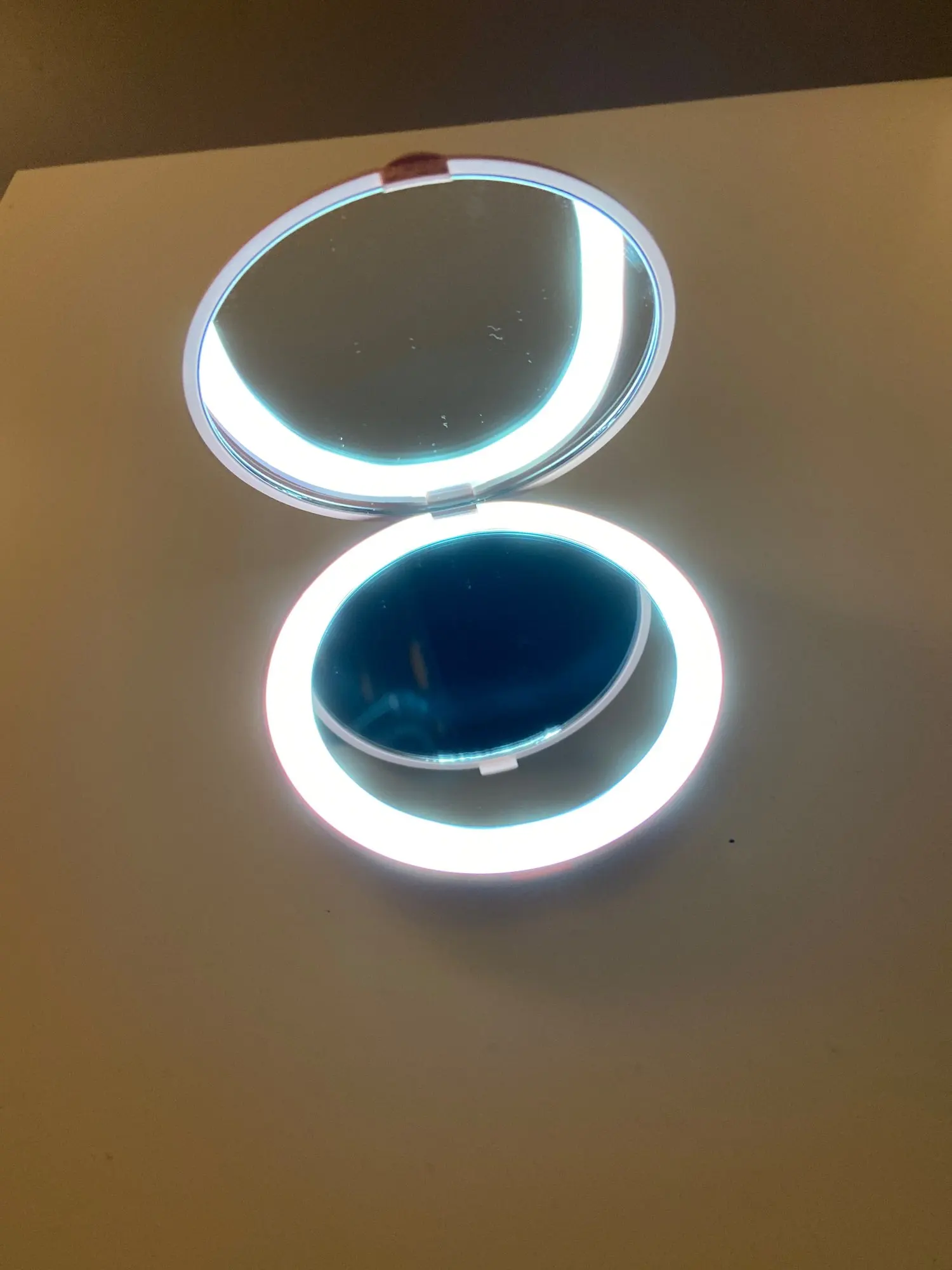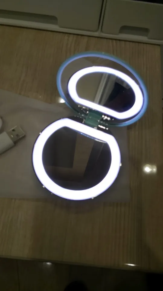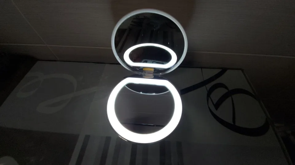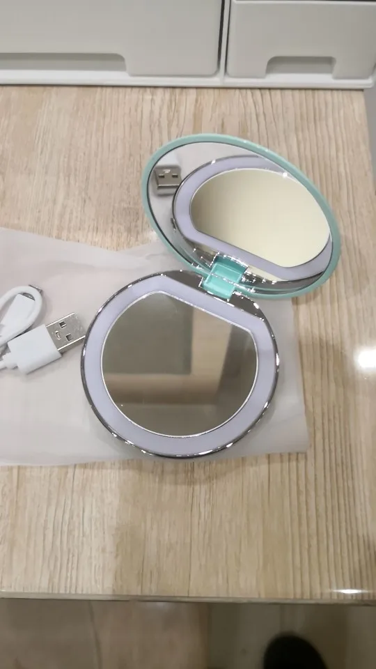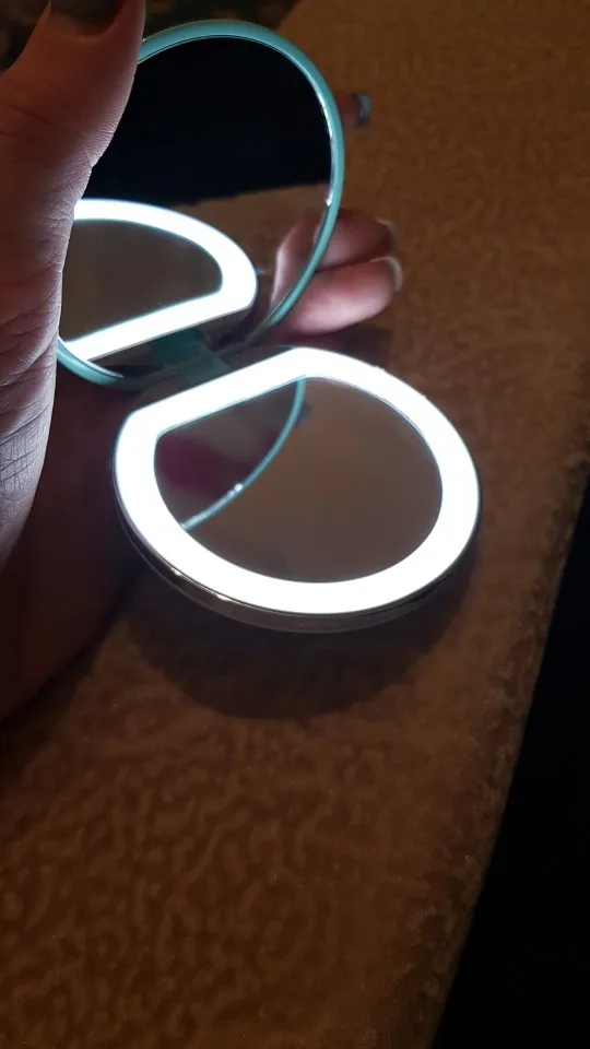 Товар пришел очень быстро! Я так доволен этим, внутри есть два зеркала: зеркало с светом отражается в истинном размере, один без света немного увеличивается. Он поставляется с зарядным кабелем и имеет 3 различных интенсивности света, вы можете изменить свет, нажав маленькую кнопку на боковой стороне зеркала. Очень легкий и не слишком толстый, я думаю, что это идеально!