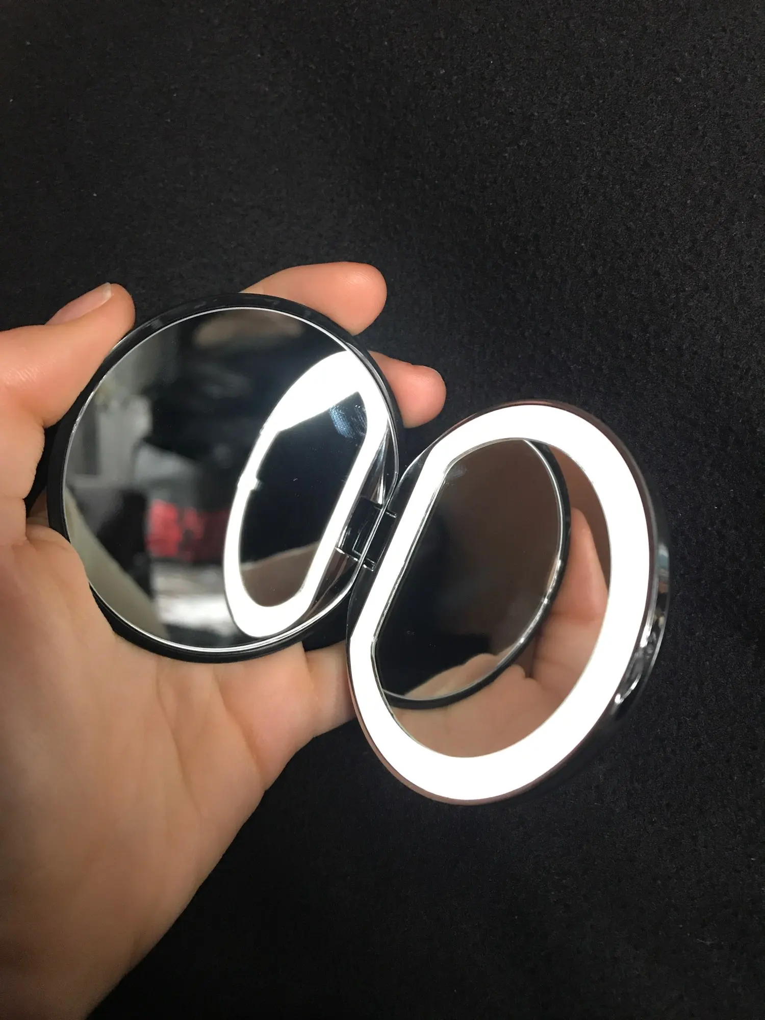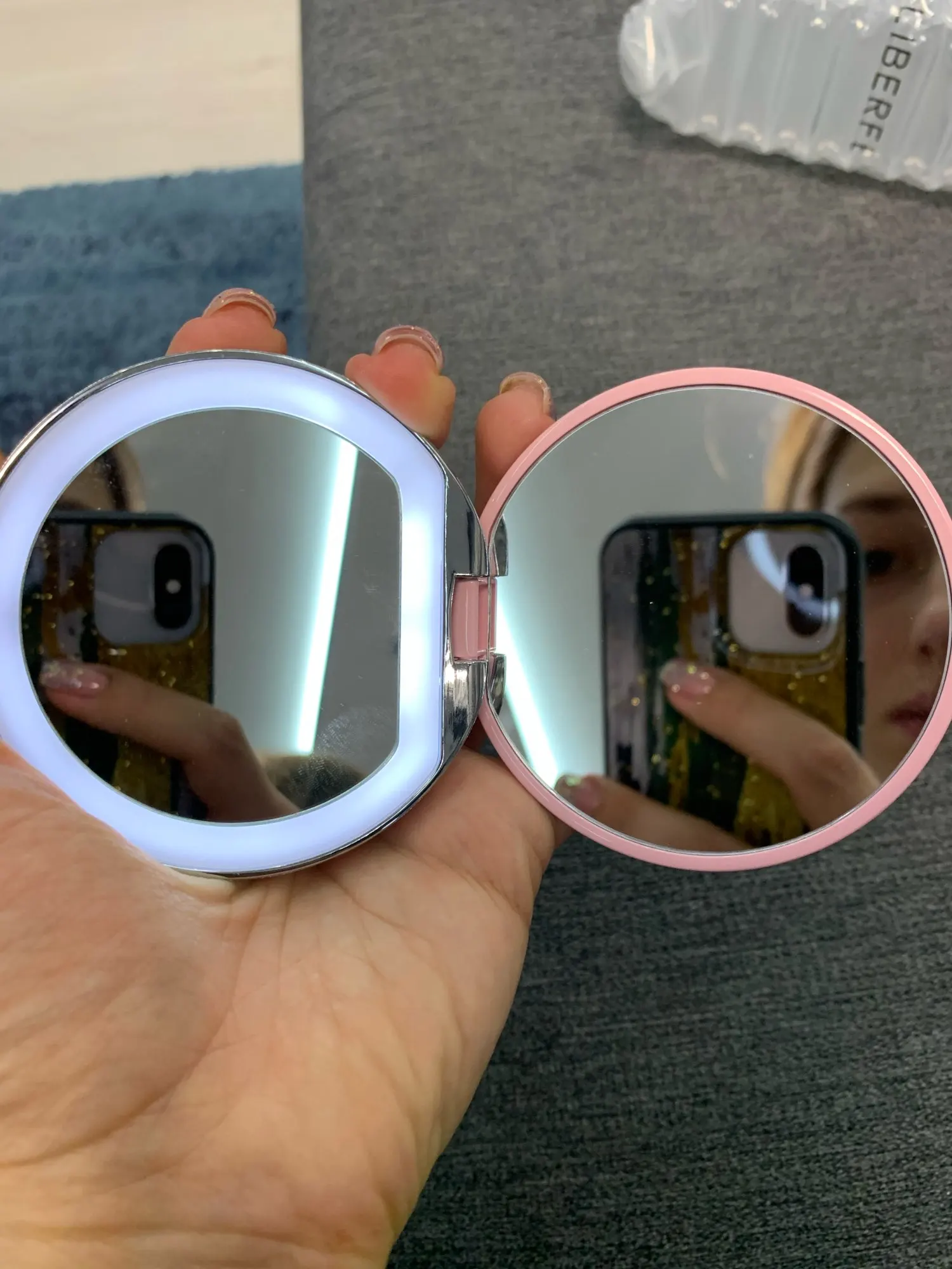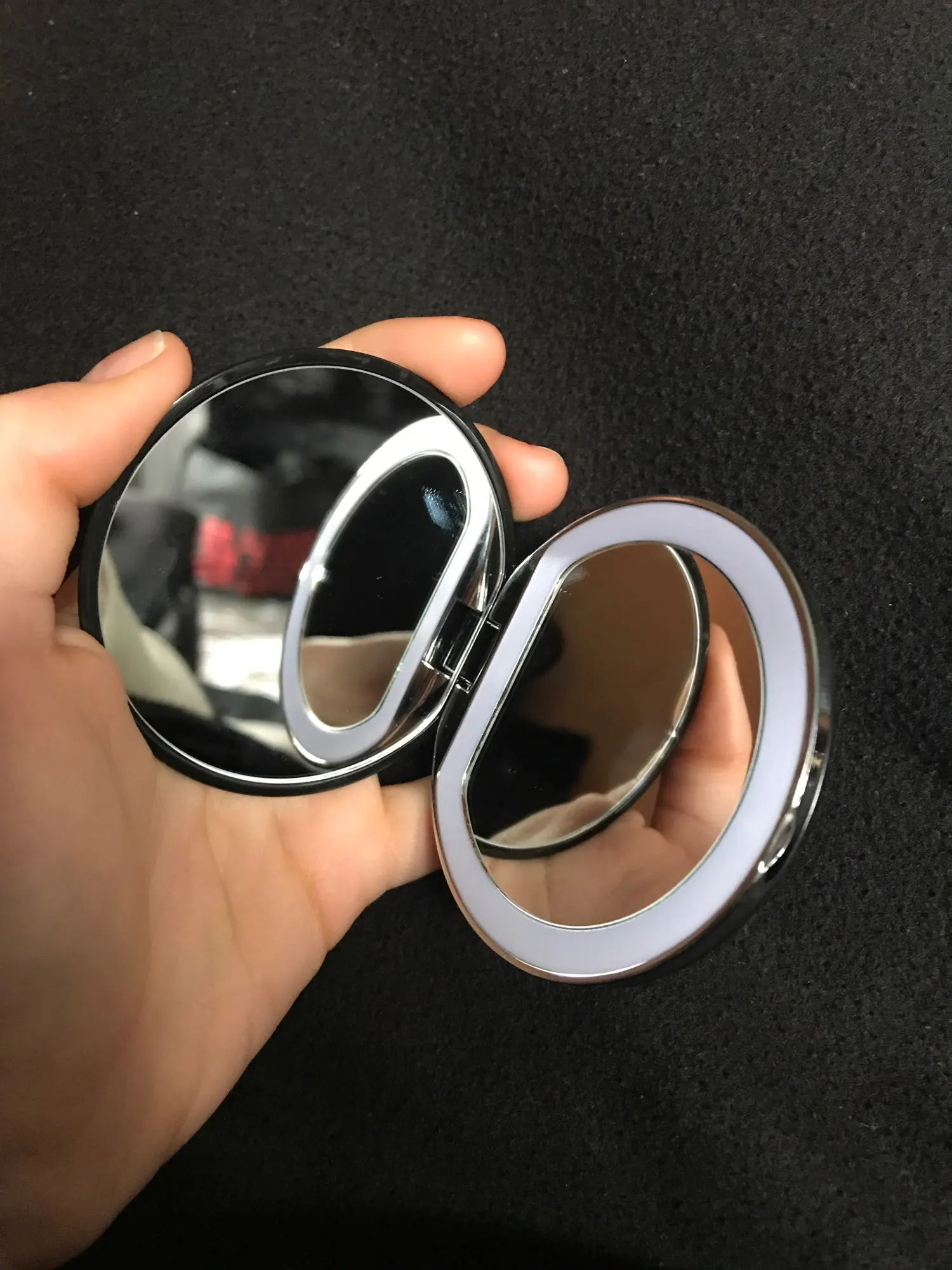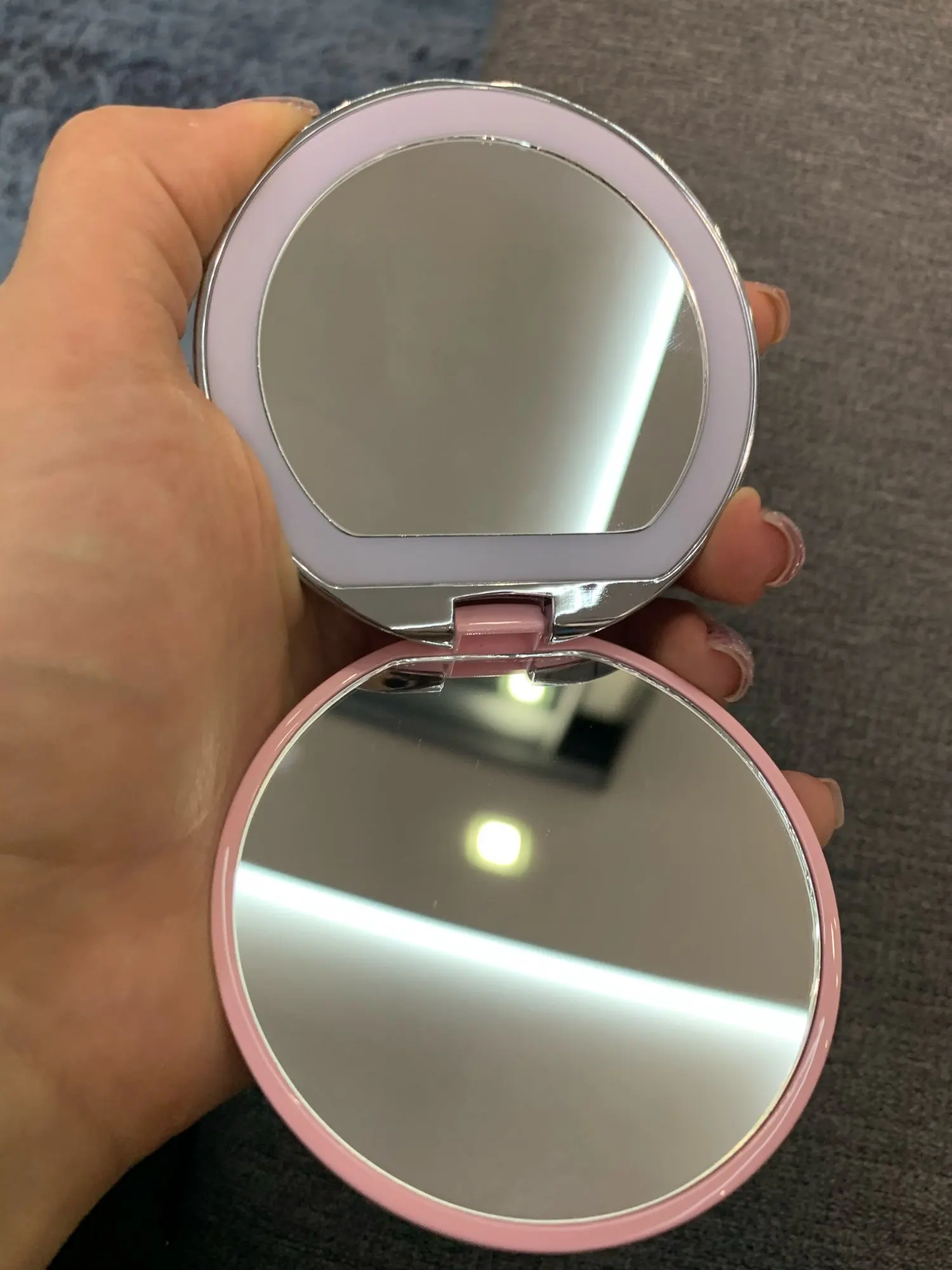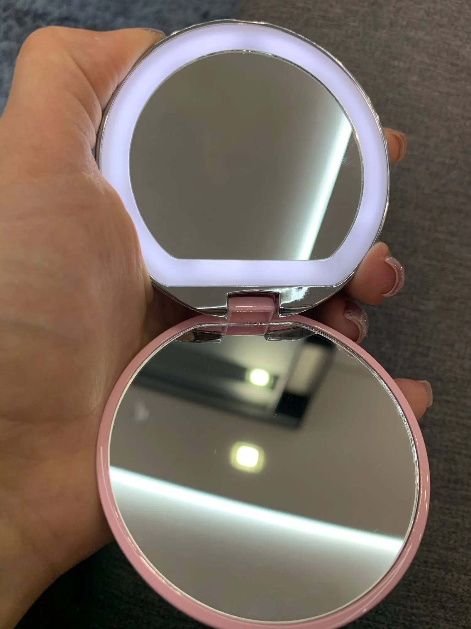 Товар пришел очень быстро! Я так доволен этим, внутри есть два зеркала: зеркало с светом отражается в истинном размере, один без света немного увеличивается. Он поставляется с зарядным кабелем и имеет 3 различных интенсивности света, вы можете изменить свет, нажав маленькую кнопку на боковой стороне зеркала. Очень легкий и не слишком толстый, я думаю, что это идеально!