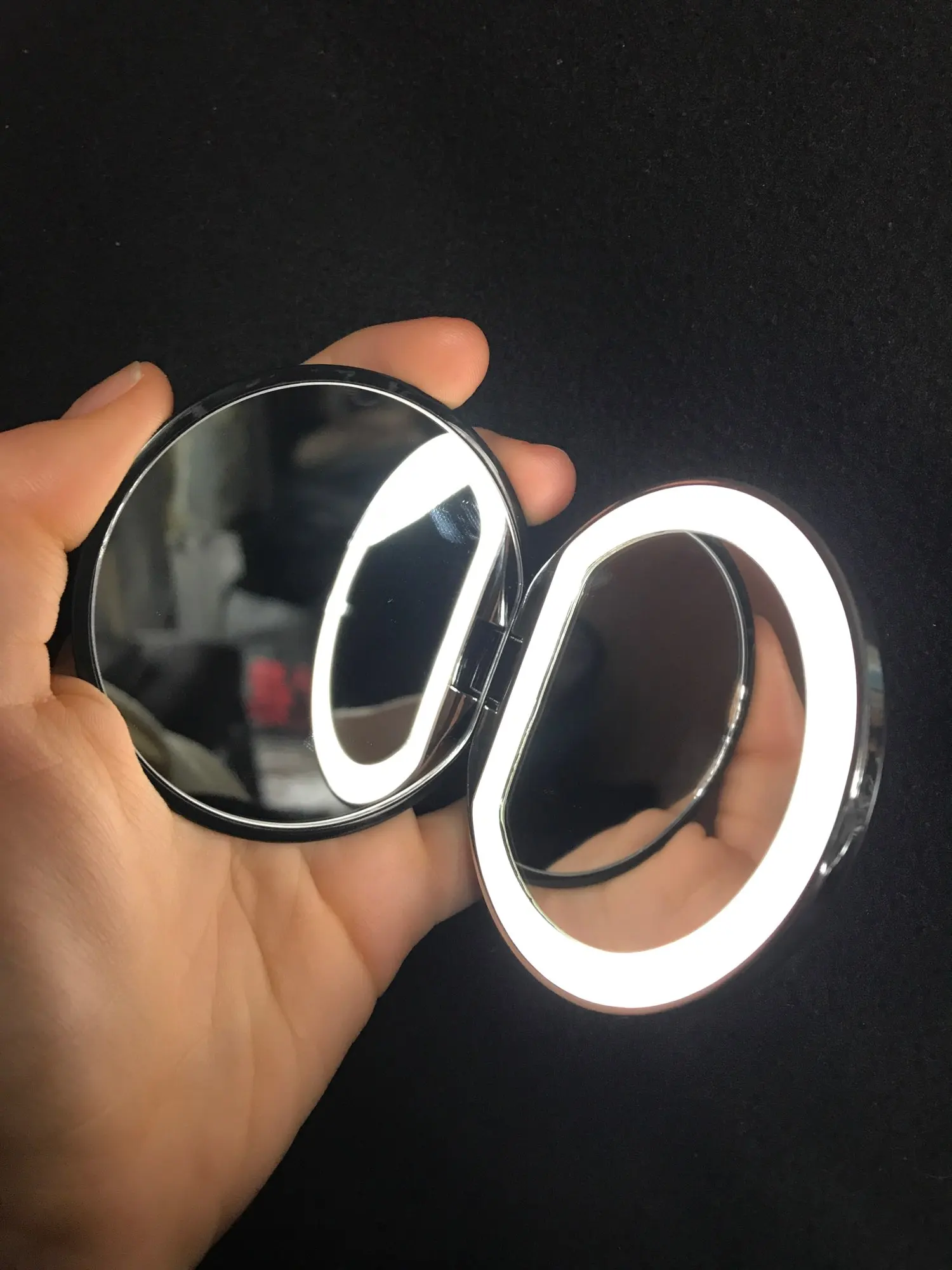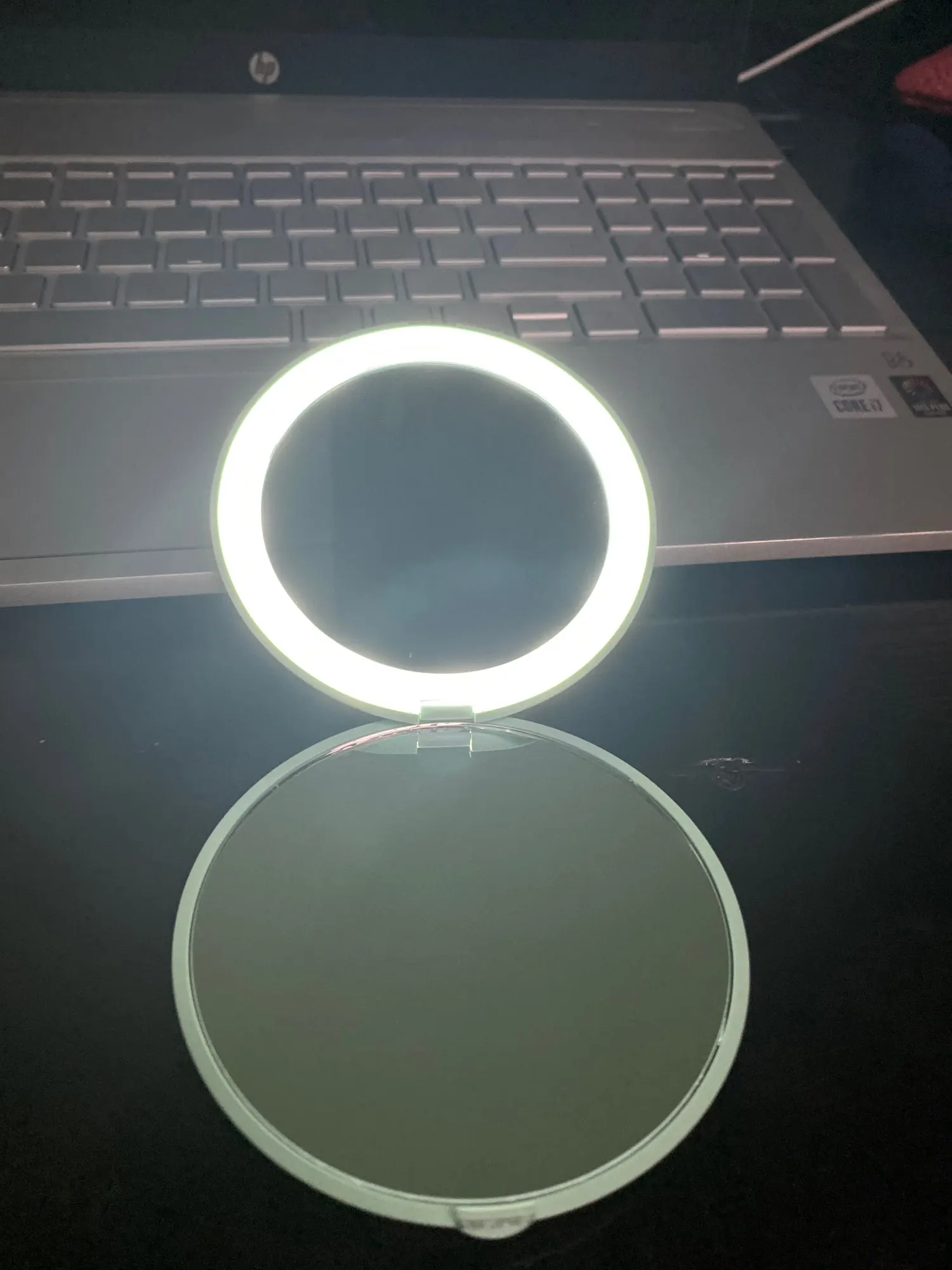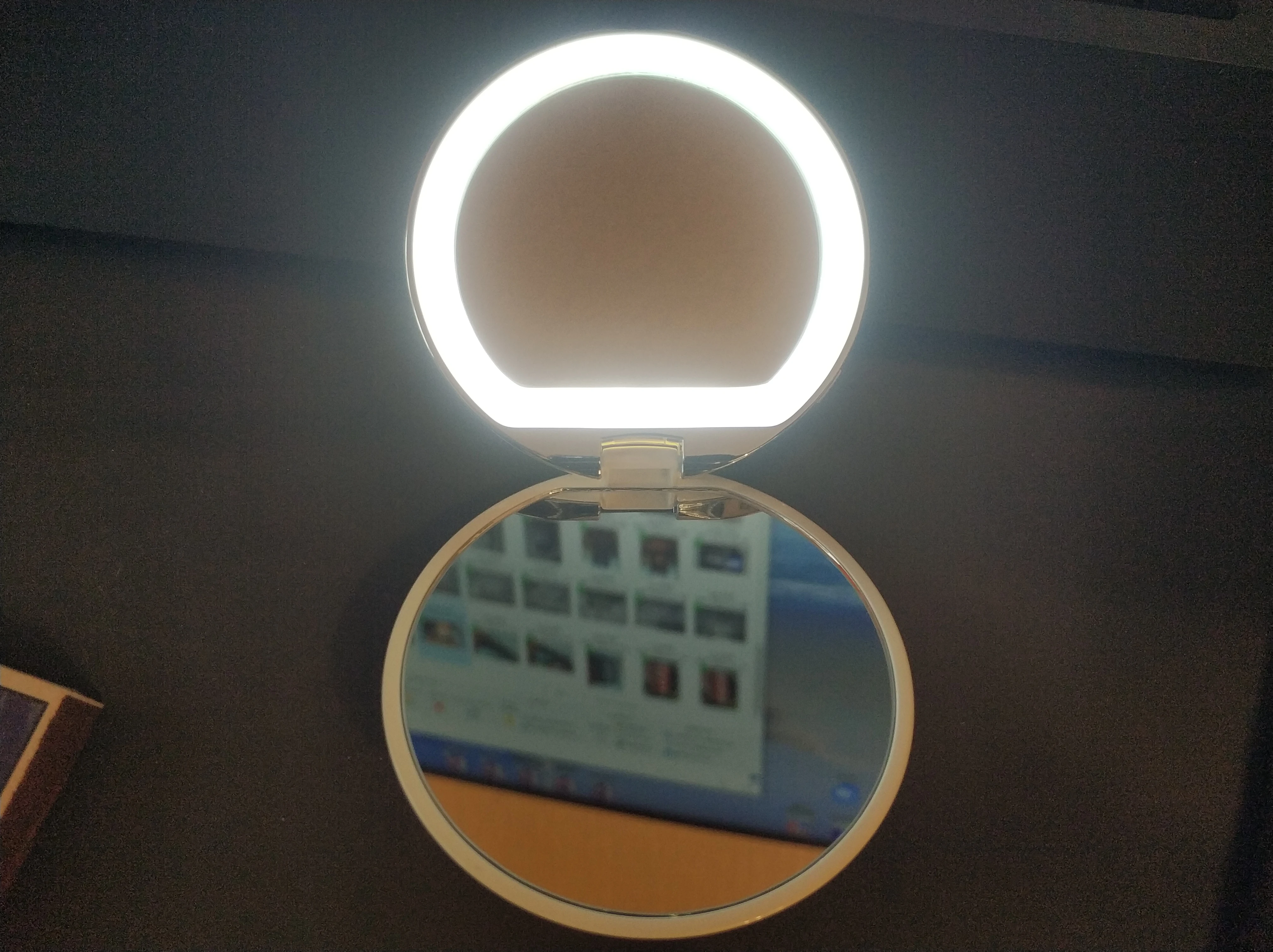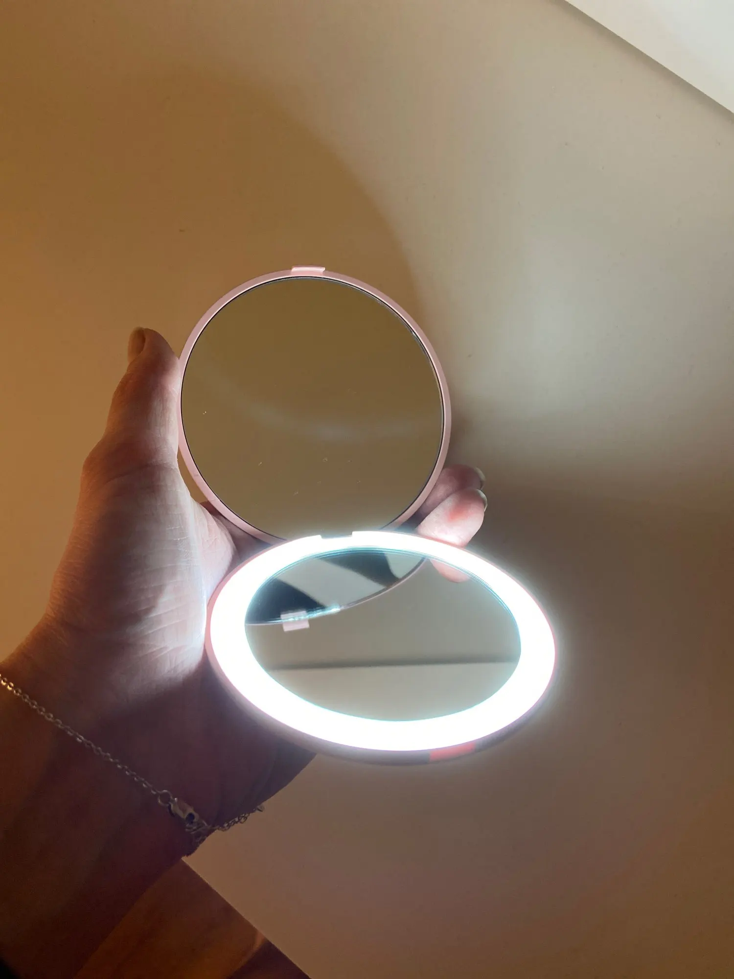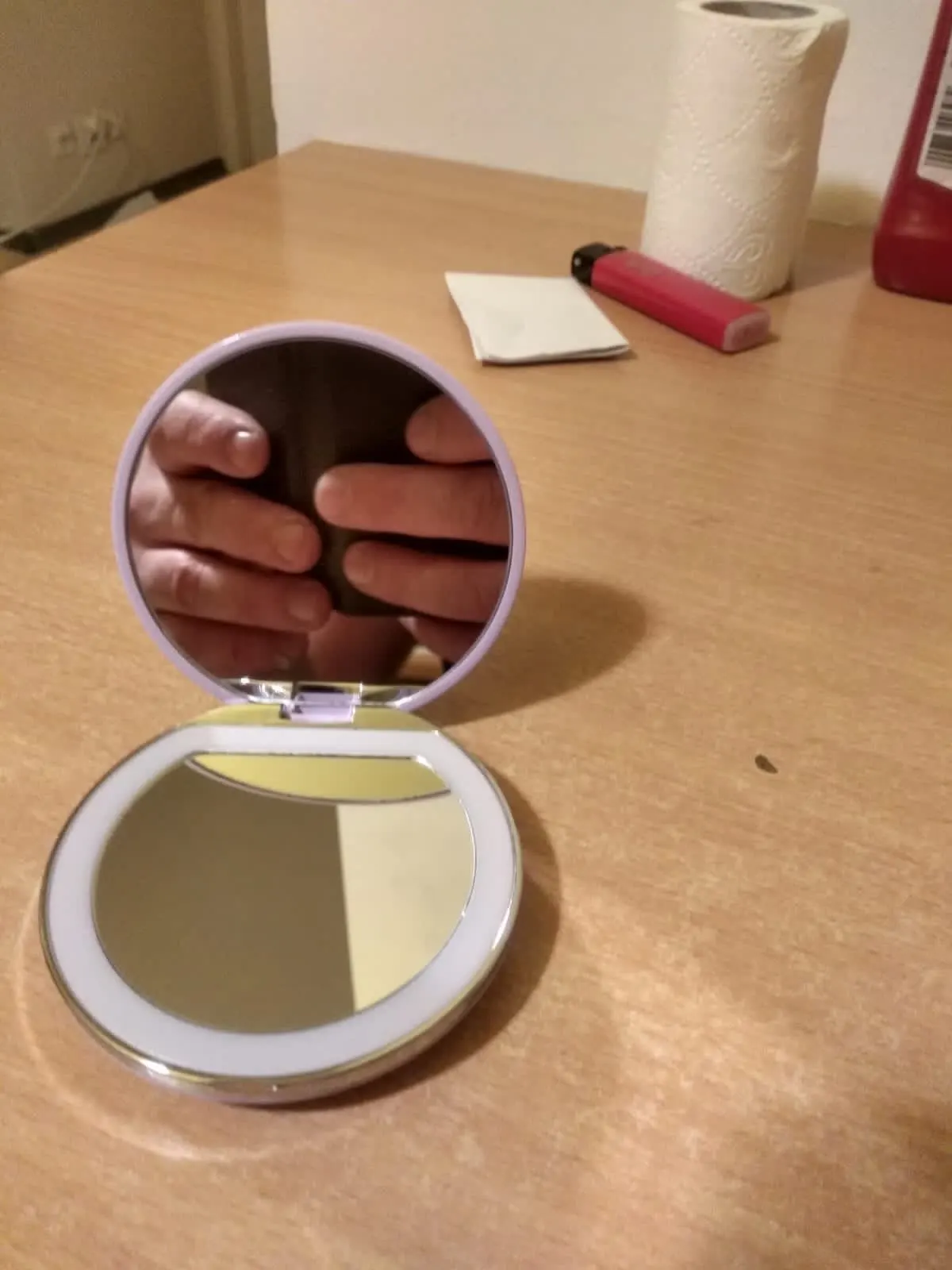 Товар пришел очень быстро! Я так доволен этим, внутри есть два зеркала: зеркало с светом отражается в истинном размере, один без света немного увеличивается. Он поставляется с зарядным кабелем и имеет 3 различных интенсивности света, вы можете изменить свет, нажав маленькую кнопку на боковой стороне зеркала. Очень легкий и не слишком толстый, я думаю, что это идеально!