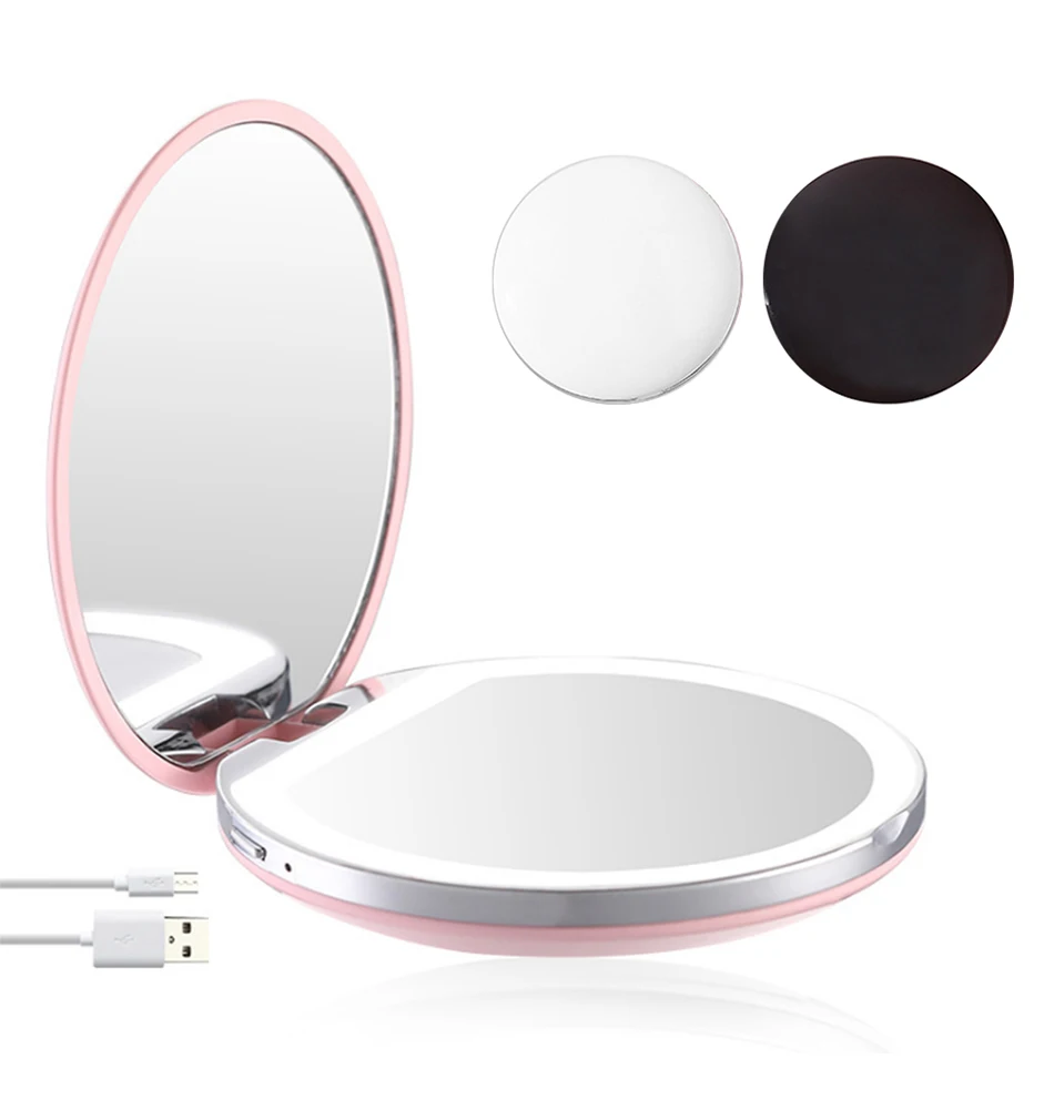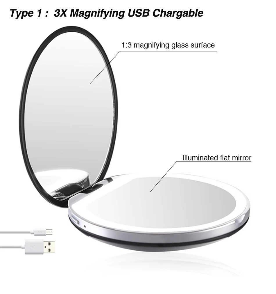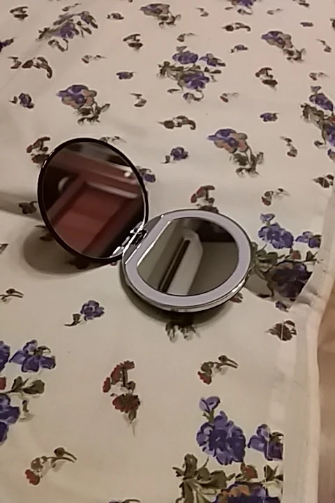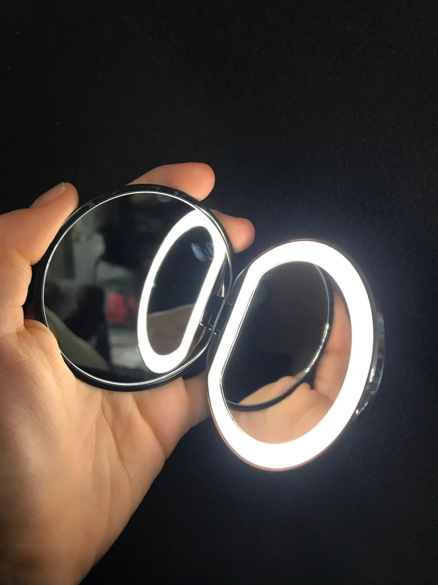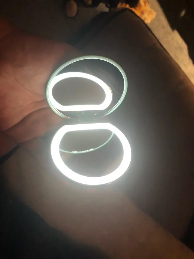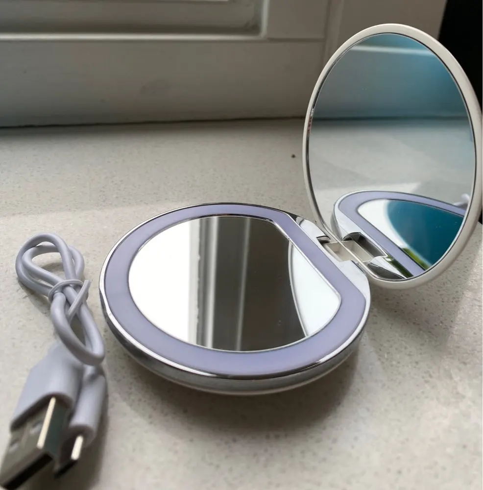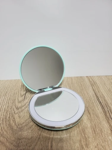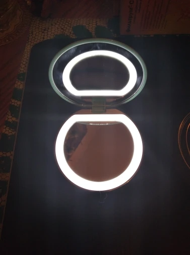 Товар пришел очень быстро! Я так доволен этим, внутри есть два зеркала: зеркало с светом отражается в истинном размере, один без света немного увеличивается. Он поставляется с зарядным кабелем и имеет 3 различных интенсивности света, вы можете изменить свет, нажав маленькую кнопку на боковой стороне зеркала. Очень легкий и не слишком толстый, я думаю, что это идеально!