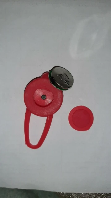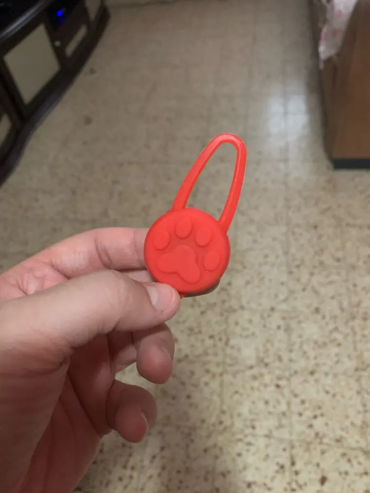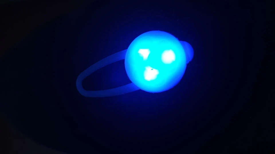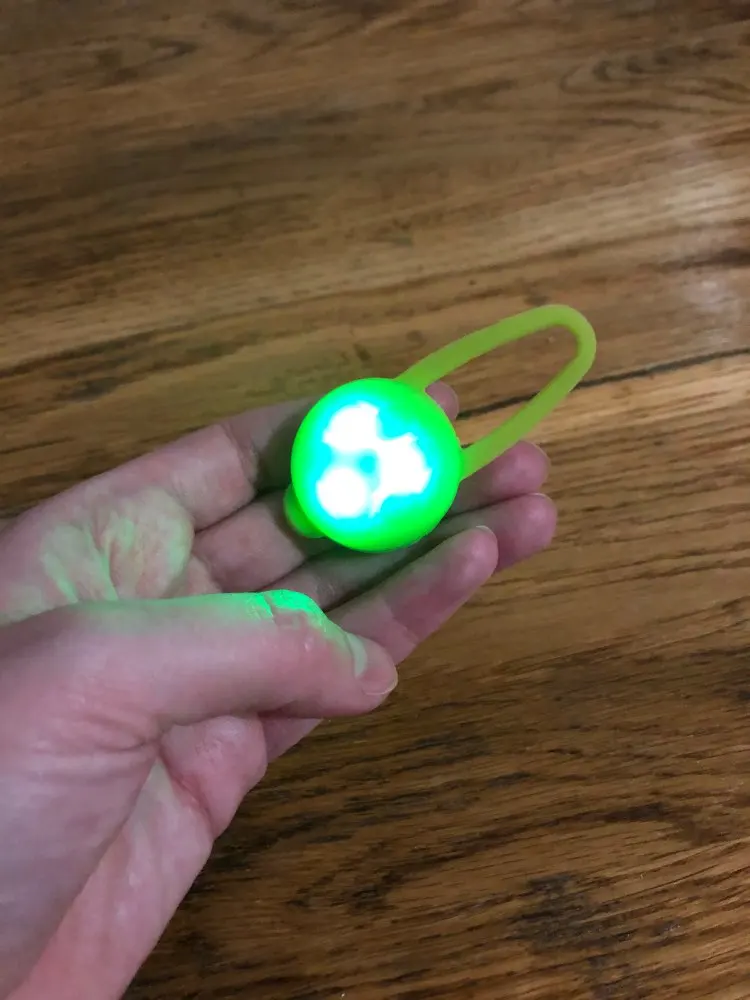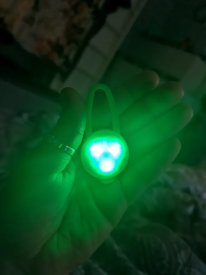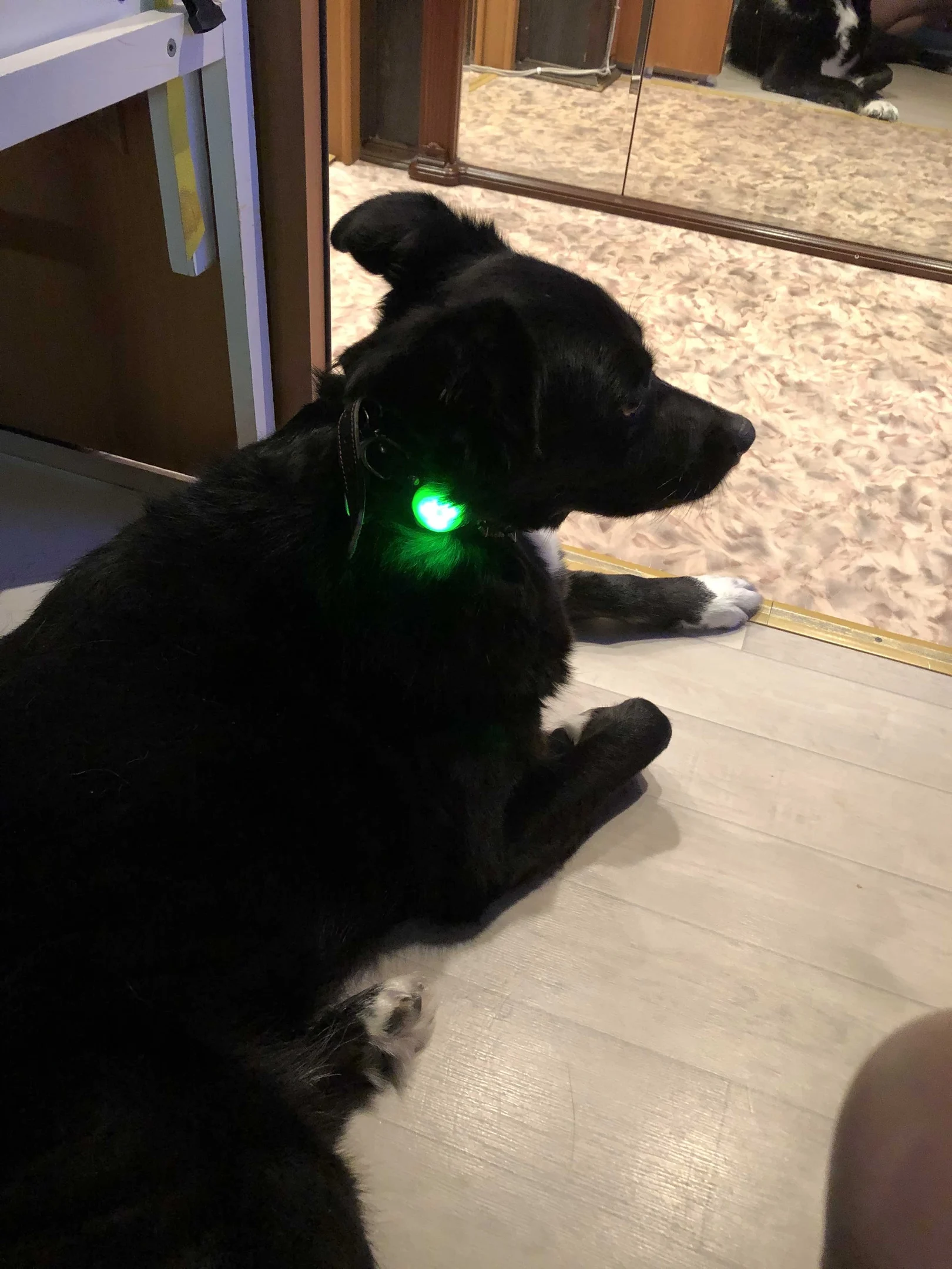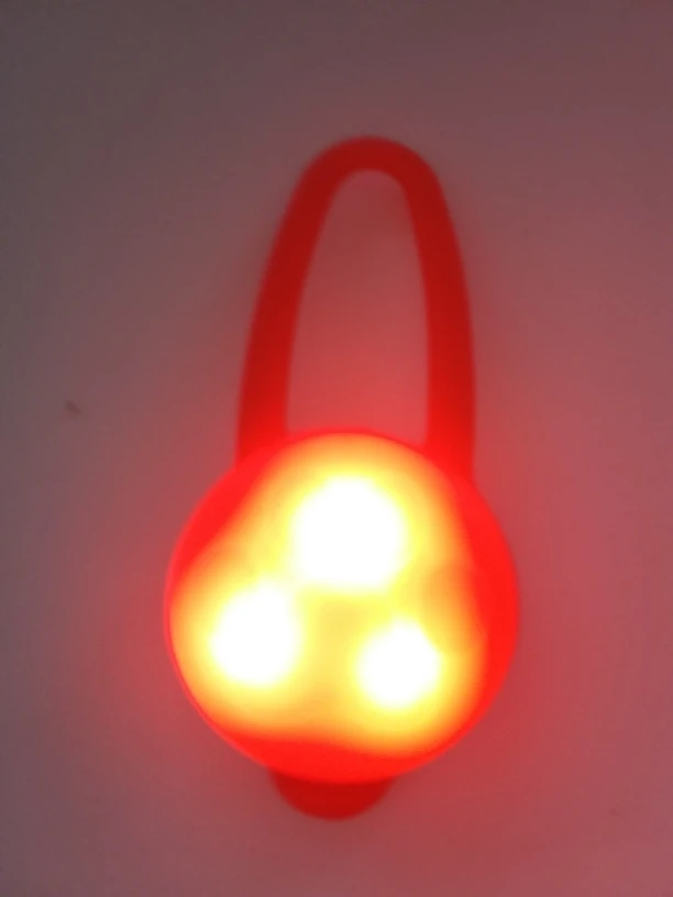 отличная штука, работает в 3 режимах: быстрое мигание, чуть медлеенее и просто стабильное свечение. легко нажимается кнопка переключения. пришел с бумажкой-блокировкой морю прикосновения батарейки и платы, сняла - все работает. внутри большая плоская батарейка CR2032. Вечером проверю как видно собаку с таким маячком