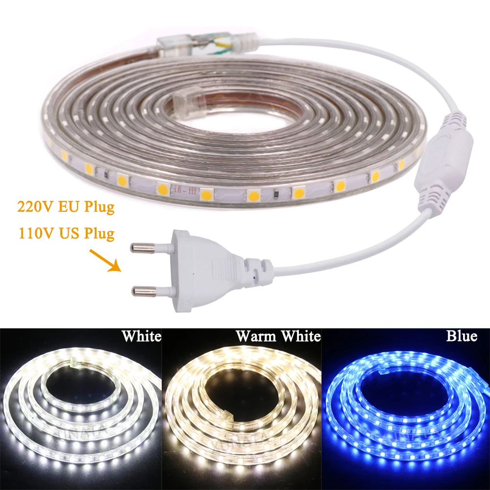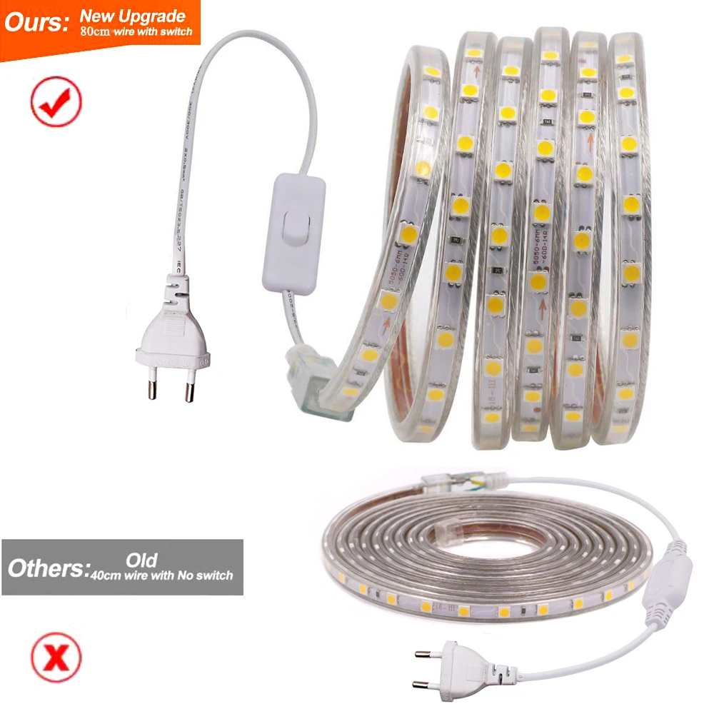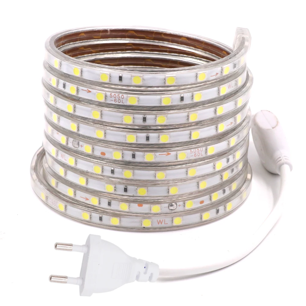 Светодиодная лента 110 В, 220 В, SMD5050, гибкая светодиодная лента 60 светодиодовм, водонепроницаемая светодиодная лента Светодиодная лента световой светильник с вилкой переключателя ЕС, США