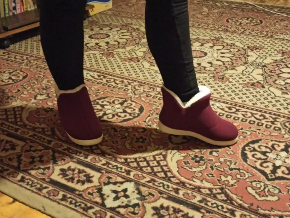 Отличные ботиночки или тёплые домашние тапочки .Сделаны аккуратно . Да и смотрятся хорошо .Пришли за три недели . Купила маме , примеряю на свои ноги (они у нас с мамой одинаковые ,) Мой русский размер 40,5 ,я купила 42-43 , они не маленькие ,но только-только .На легкий носок . Моя нога плоская ,но шорокая.По мне- чуть свободнее , было бы комфортнее . Спасибо . Хорошая покупка .