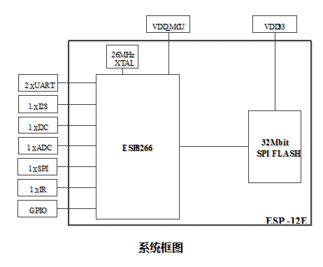 Подвесной интерфейс: HSPI, UART, I2C, I2S, IR пульт дистанционного управления, PWM, GPIO;