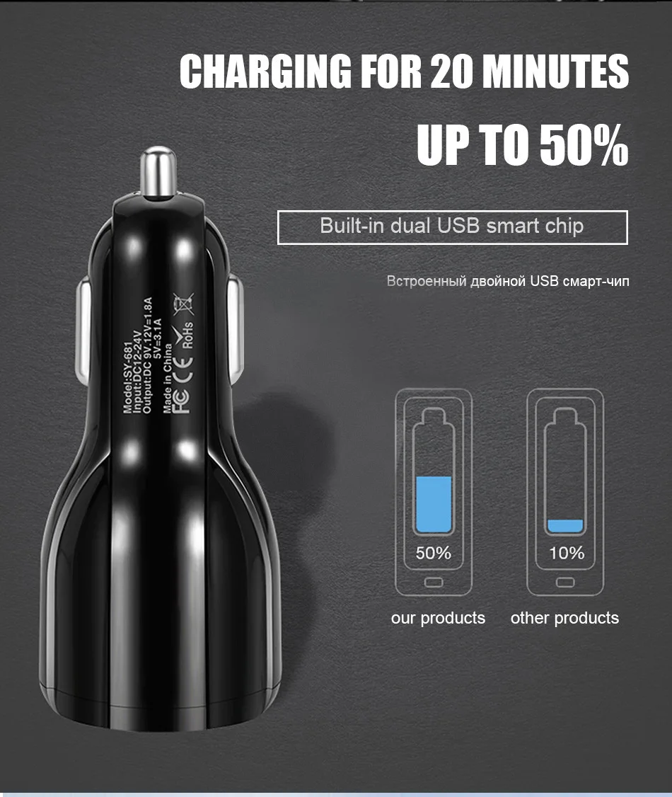 5V 3.1A светодиодное зарядное устройство для автомобиля с двумя пор...