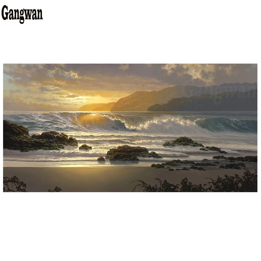 Алмазная вышивка С закатом на пляже, пейзажем, квадратная круглая морская волна, пейзаж, картина из страз, Настенная картина, Декор