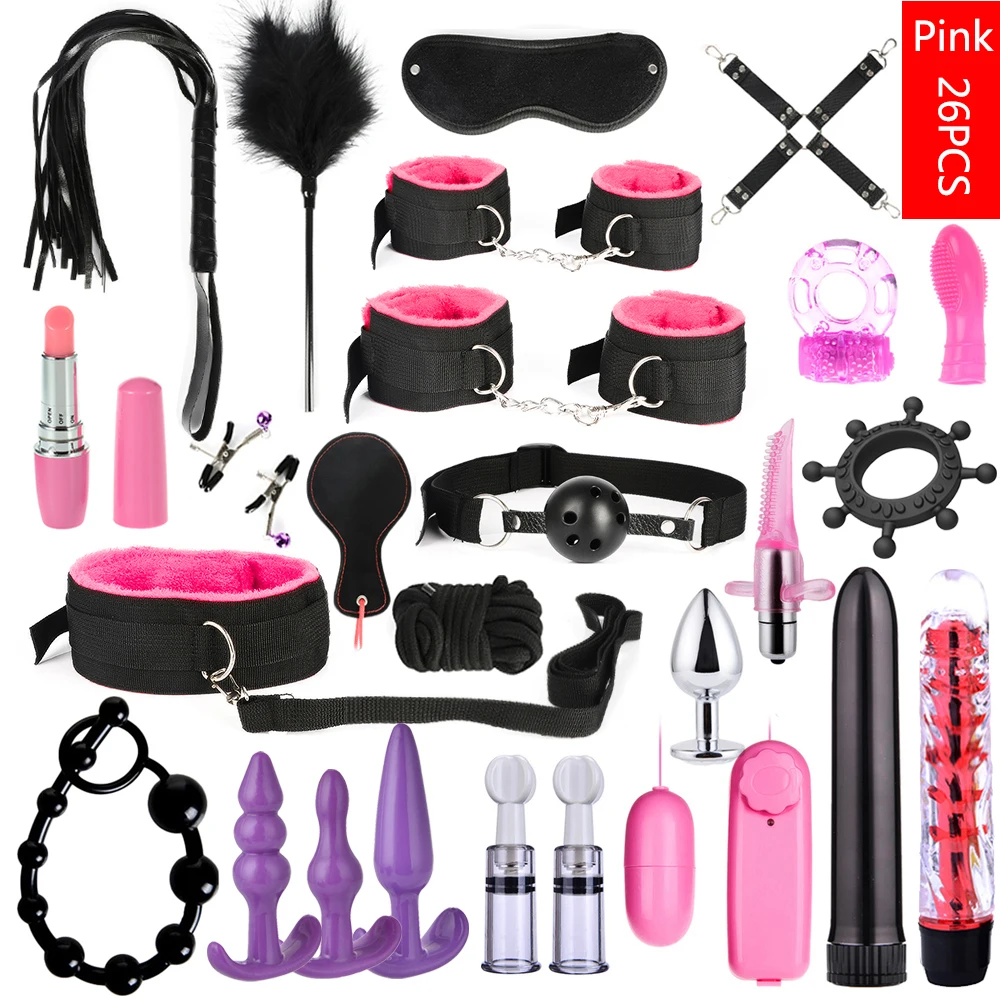 Набор для бондажа интимные игрушки для взрослых женщин и мужчин, 26 шт., наручники, зажимы для сосков, кнут, рот, кляп и веревка, фаллоимитатор, вибратор, эротические игрушки