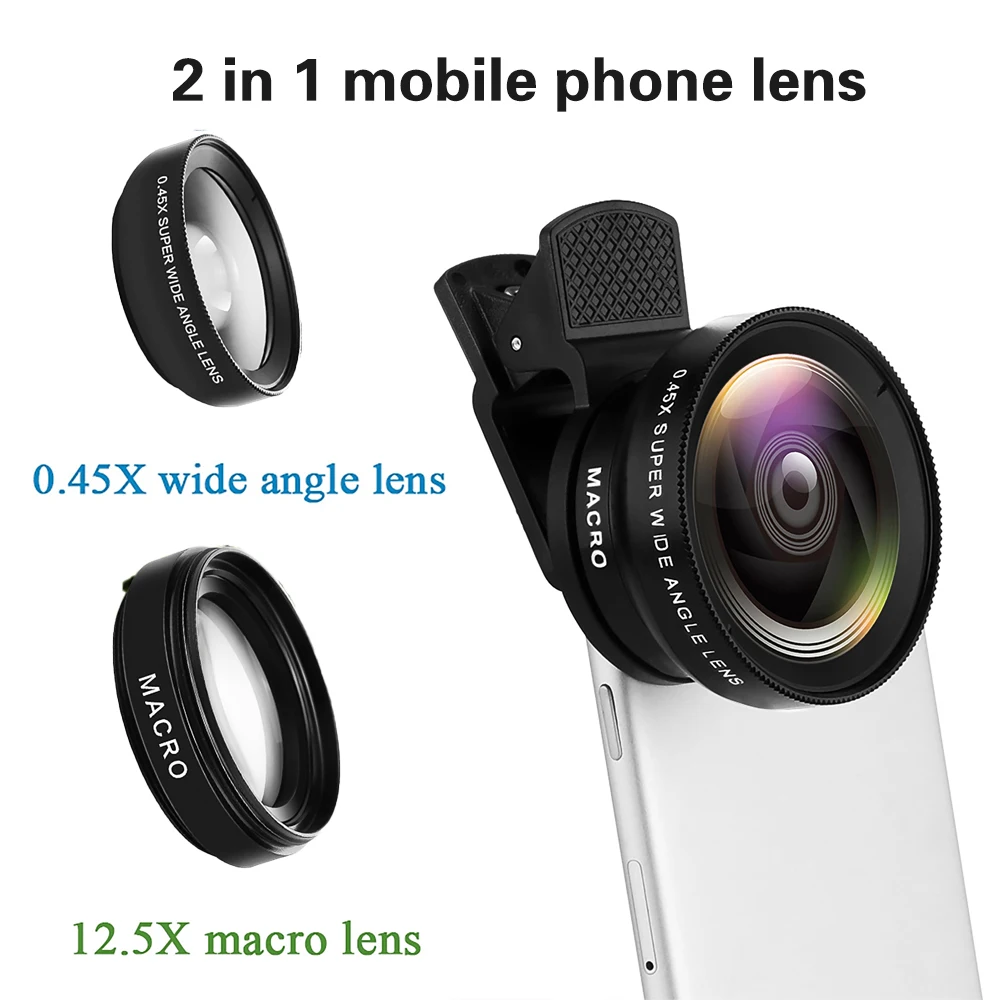 Особенности:Дизайн 2 в 1Uper wide 0.45X широкоугольный объектив + 12,5x макрообъектив, с 0. 45-кратный широкоугольный объектив, расширяющий обзор, идеально подходит для съемки больших диапазонов, особенно идеально подходит для групповых снимков, которые идеально удерживают большую группу людей на одной фотографии, без темных углов.Четкое изображениеОн разработан с выпуклой структурой с одним объективом, многослойным покрытием, четким изображением и четким изображением.Материал высокого качестваЛинза изготовлена из Аэро-алюминия и немецкого импортного оптического стекла, поверхностное окисление многоканальной технологической поверхности является стабильным, а Защитная линза имеет большую текстуру.Микроскопическая фотографияМакрообъектив отлично подходит для детальной съемки крошечного предмета, идеально подходит для съемки цветов, травы, монет, насекомых и т. д. С ним, весь мир пейзаж, снятый в вашем мобильном телефоне, Высококачественный объектив камеры сотового телефона, делает хорошие воспоминания для продолжения. Универсальное использованиеПодходит для большинства смартфонов, Ipad, планшетов с диаметром камеры меньше или равен 13 ммНесравненное Качество: уникальный внешний вид объектива камеры делает его стильным и гладким, мягкий резиновый зажим легко регулируется и не оставляет царапин или следов на вашем мобильном устройстве.ИнструкцииШирокоугольный объектив и макрообъектив прикручиваются вместе, чтобы использовать макрообъектив, вам нужно разделить два объектива, откручивая, затем, держа 1-2 см на расстоянии от объекта, вы получите более четкие изображения, а чтобы использовать широкоугольный объектив, необходимо оставить прикрученные две линзы.