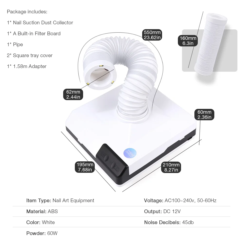 1 * пылеуловитель для всасывания ногтей 1 * Встроенный фильтр 1 * труба 2 * Квадратная Крышка лотка 1 * адаптер 1,58 м