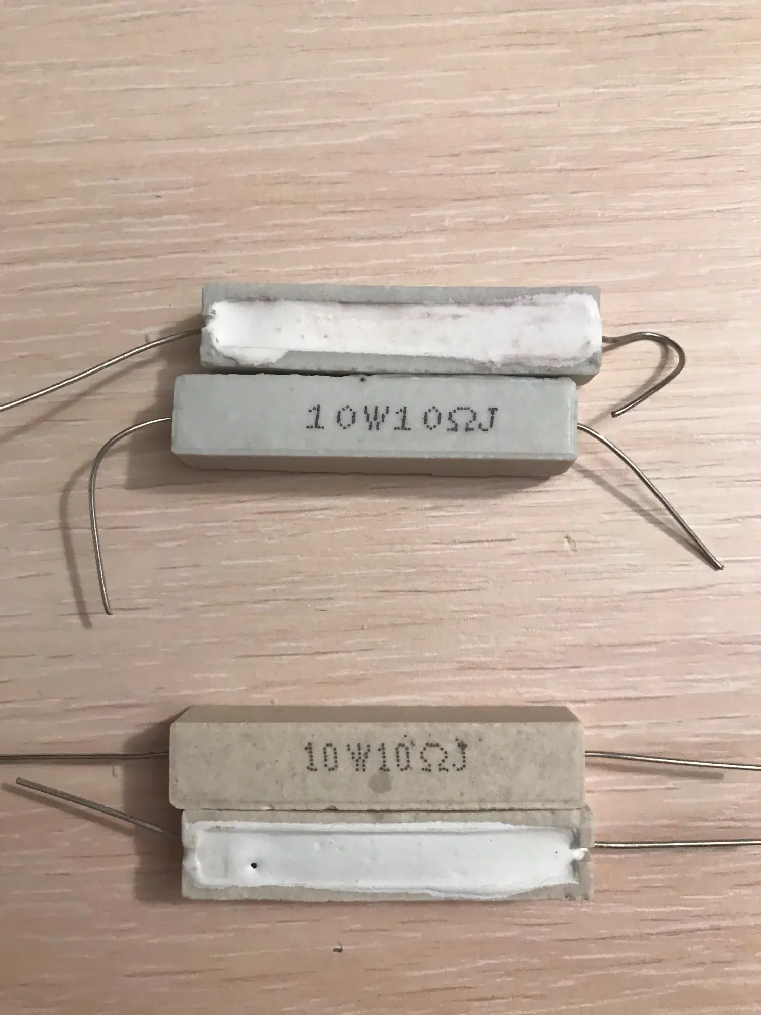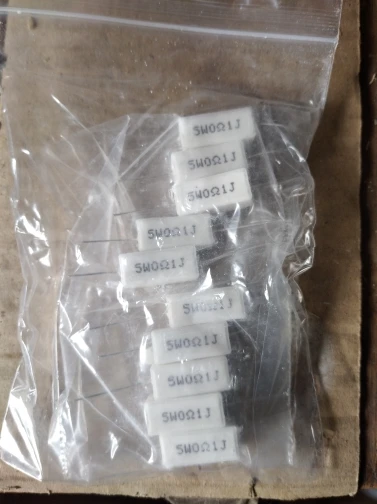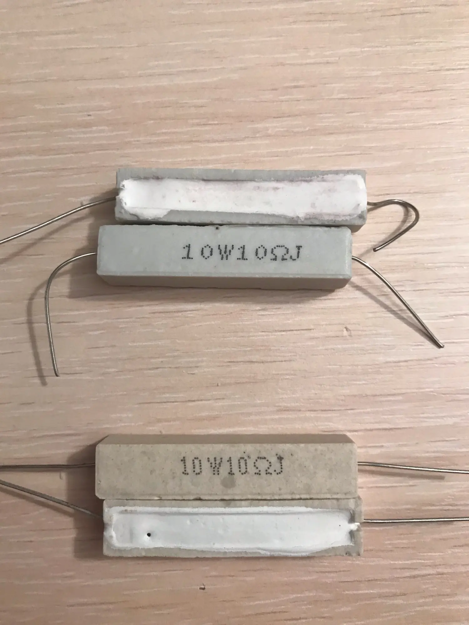 Цементные резисторы 5w номиналы 5, 10, 100 и 1000 ом по 10 штук каждого. Выводы магнитятся. В целом выглядят прилично, померил один, показывает 10,1 Ом (номинал 10).