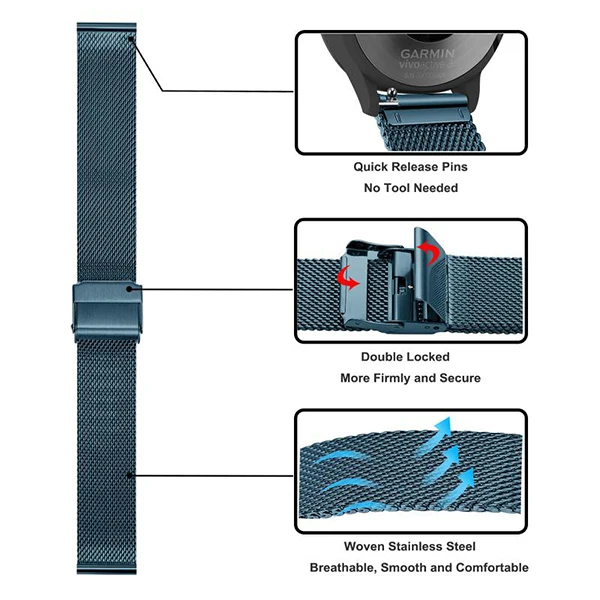 Особенности товара: -Материал ремешка: Высококачественная нержавеющая сталь (Миланская сетка) -Тип застежки: Двойная Защитная складная застежка -Цвет ремешка: Розовое золото, розовое золото, серебро, черный, серебро, шампанское золото, серебро черный, черный серебро, облако серебро, красочный, синий -Размер: Подходит для запястья 5,3 ''до 8,1'' (135 мм до 205 мм), охватывающих большинство Для женщин и мужчин. -Особенности: Элегантный и благородный, дышащий и прочный, гладкий и удобный в ношении; Быстросъемный дизайн, просто установите и отсоедините ремешок вручную, не требуется никаких инструментов -Посылка включает в себя: 1 x ремешок для часов, 3 x БЫСТРОРАЗЪЕМНАЯ пружинная планка, 1 x стрелка для часов (для регулировки длины ремешка для первоначального использования) -Совместимость с: Для Garmin Vivomove HR / Vivomove 3 / 3S / Vivoactive 4 / 4S / Vivoactive 3 / 3 Music / Venu Sq Music / Venu 2 45 мм/Venu 2S 40 мм/Люкс/стиль