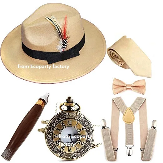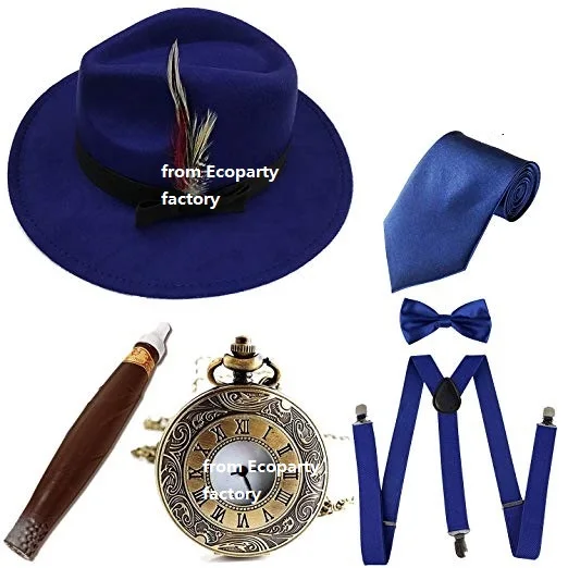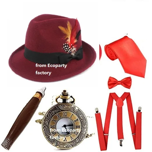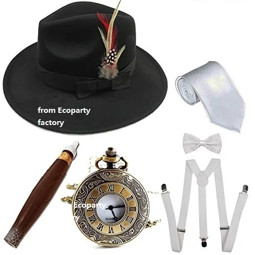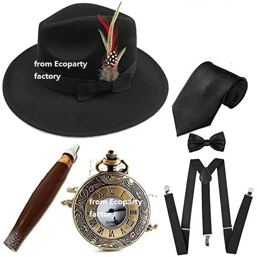 Мужские аксессуары для костюма в стиле 1920-х Гэтсби, шляпа с федорой Манхэттена с перьями, винтажные карманные часы, подтяжки, предварительно завязанный Галстук-бабочка Coldker