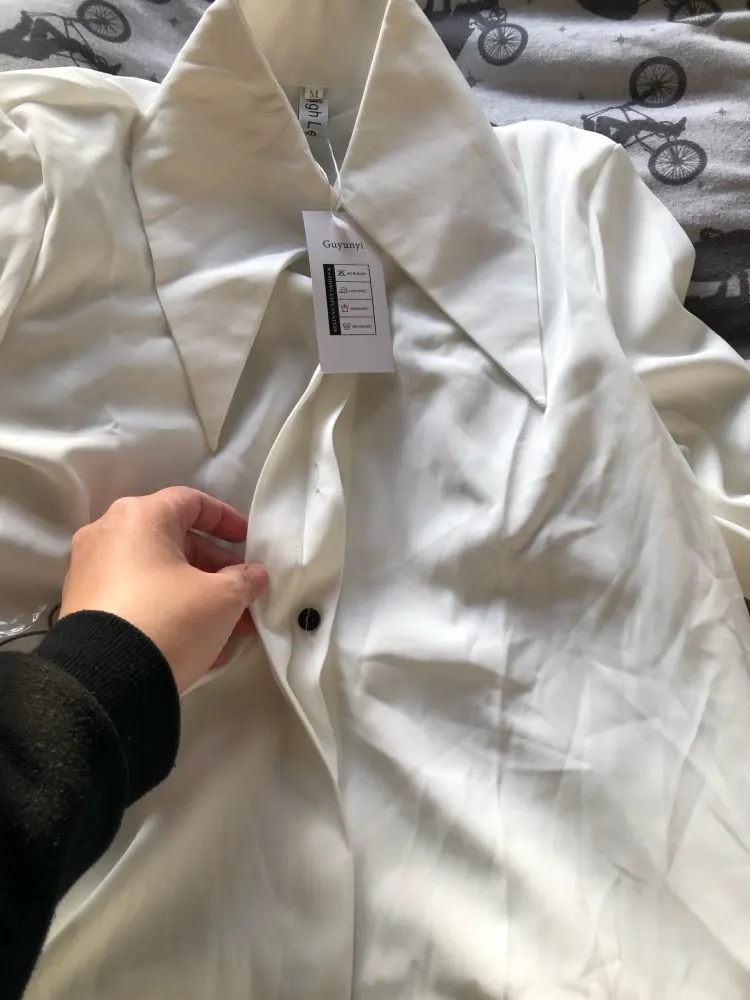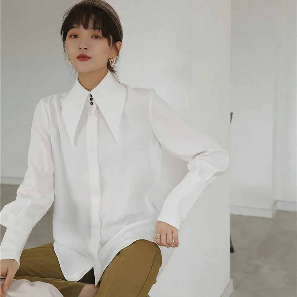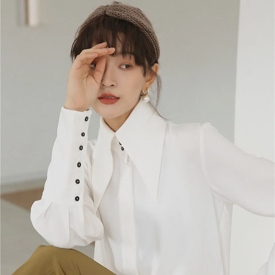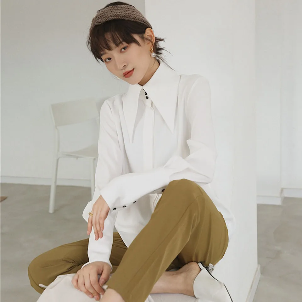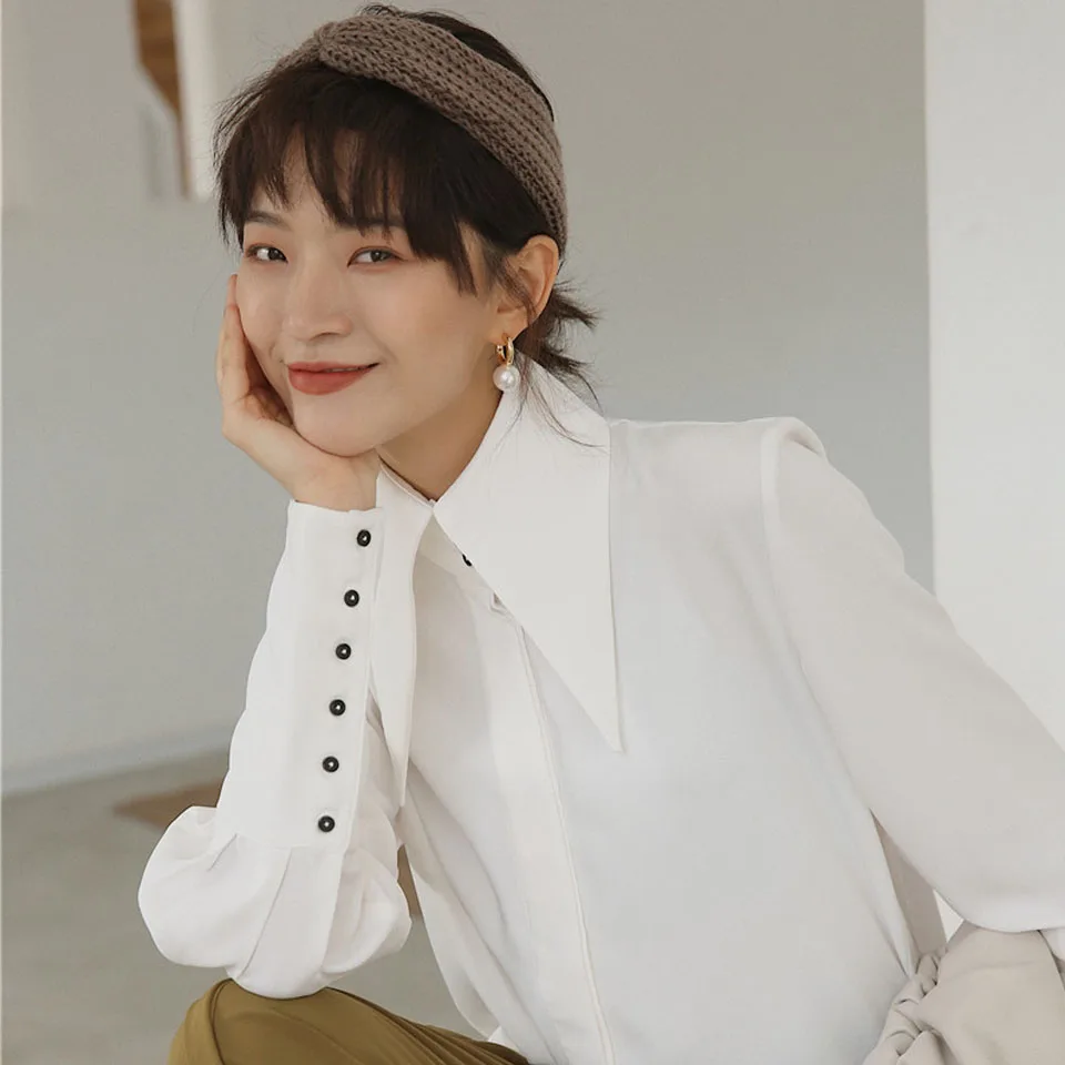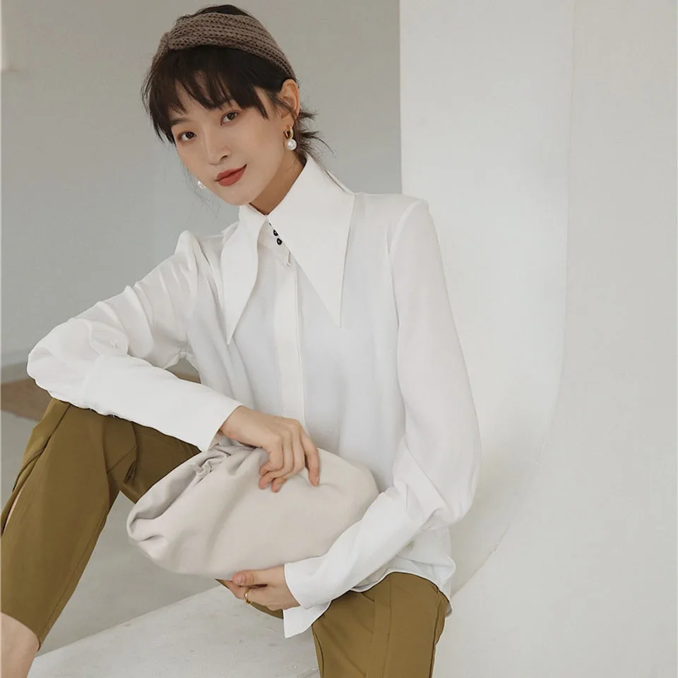 Женская винтажная блузка, белая Свободная рубашка с длинными рукавами-фонариками и большими заостренными лацканами, осень 2020