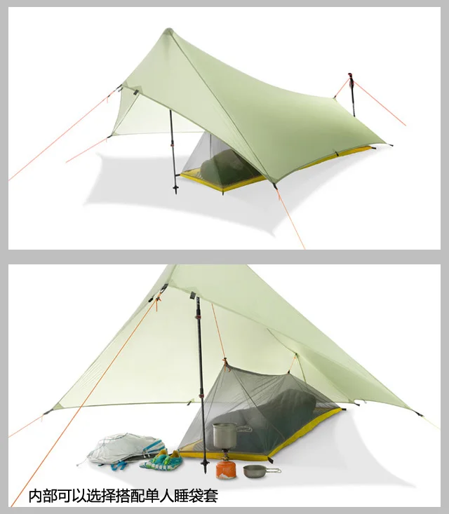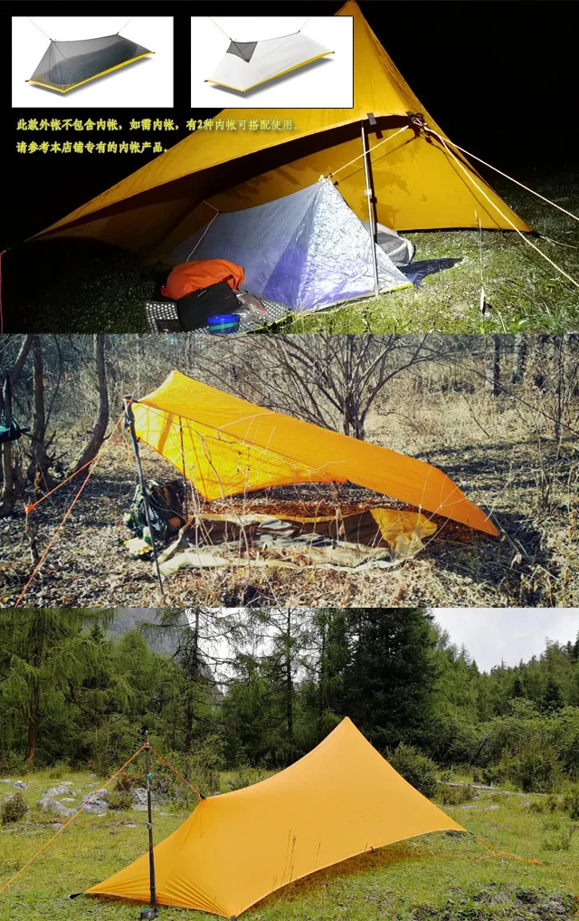 Бренд: flame's CREED Цвет: оранжевый/серый Материал: 20d нейлоновое двухстороннее силиконовое покрытие, без уплотнительной ленты, необходимо самостоятельно чистить клей Вес: около 320 г (без учета веса аксессуаров) Около 430 г (палатка + аксессуары) Посылка включает в себя: 1 брезент, 6 колышков