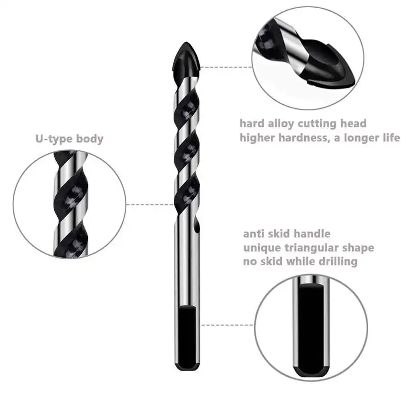 Материал головки из сплава с более сильной твердостью.При сверлении твердого материала (стекло, фарфоровая напольная плитка, мрамор или гранит), пожалуйста, используйте воду для смазки.Конструкция треугольной ручки, более стабильная работа.U-образная конструкция слота, способствующая удалению микросхем, не повреждает плиточную стену.Обычное ударное сверло, пистолет сверло может быть установлен на использование, украшение легко носить с собой.Цвет: черный + серебристыйМатериал: карбидРазмеры: диаметр лезвия 3 мм 4 мм 5 мм 6 мм 8 ммПосылка:5 шт. * Плитка битТолько вышеуказанная посылка, другие товары не включены.Примечание: светильник и различные дисплеи могут привести к тому, что цвет товара на картинке немного отличается от реального. Допускается погрешность в измерениях +/- 1-3 см.