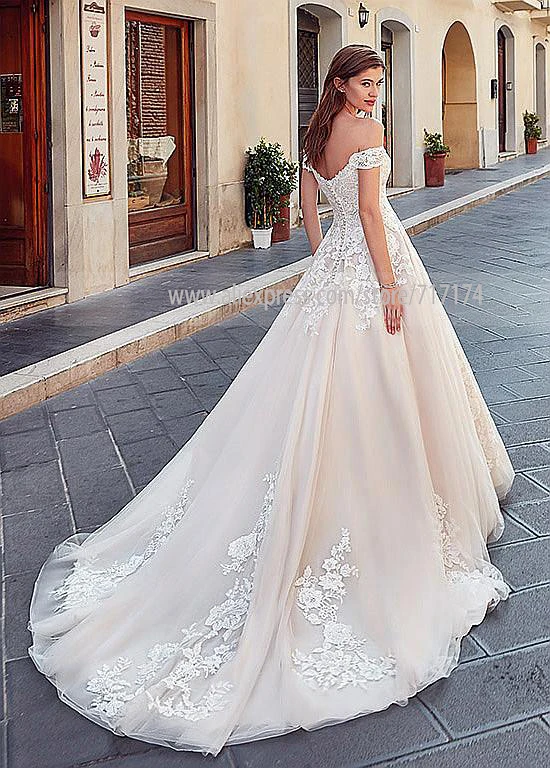 Свадебное платье-трапеция с открытыми плечами, кружевной аппликацией и пуговицами на спине со шлейфом
