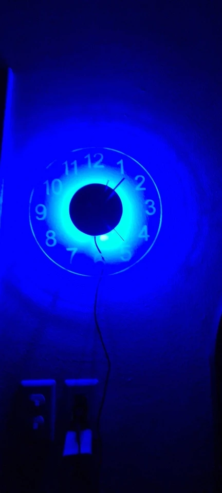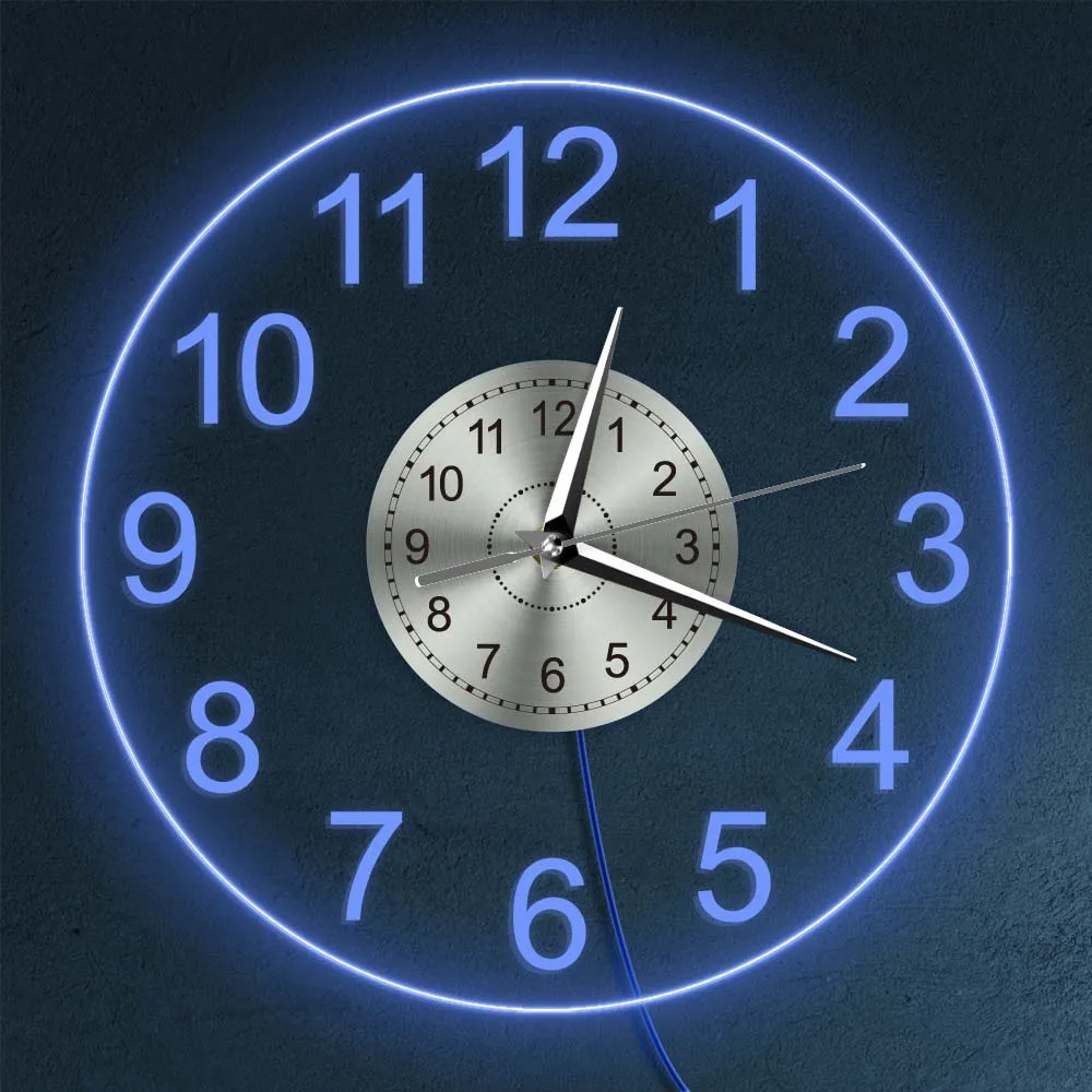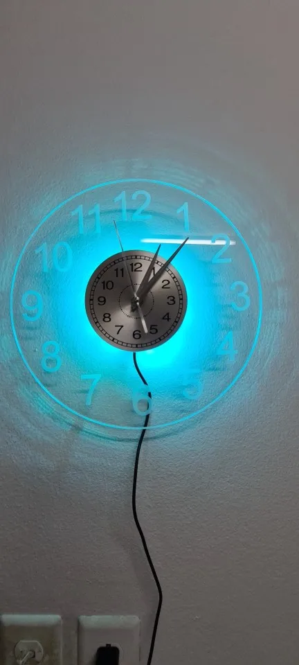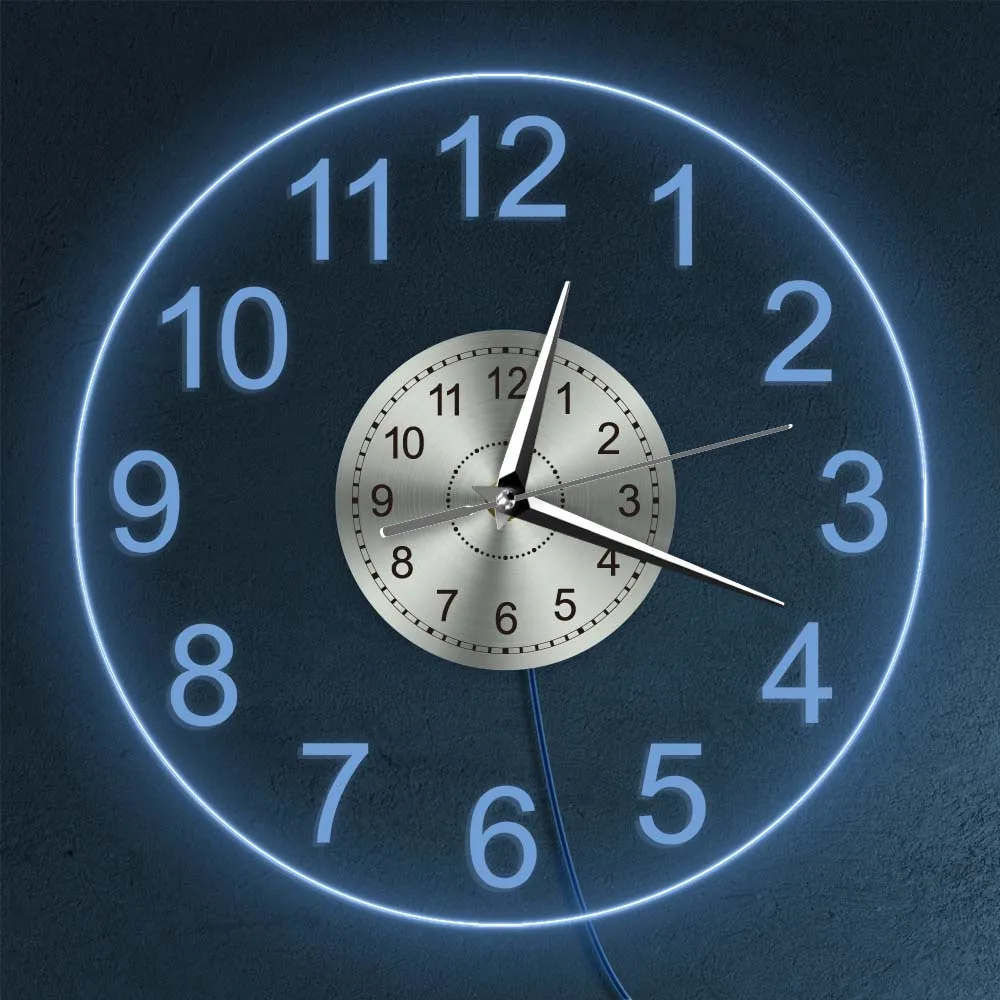 Настенные часы с подсветкой изготовлен из прозрачного акрила толщиной 3 мм со светодиодным компонентом. В этих 12-дюймовых круглых часах есть светодиоды, которые светят через центр часов и загораются цифры и края.