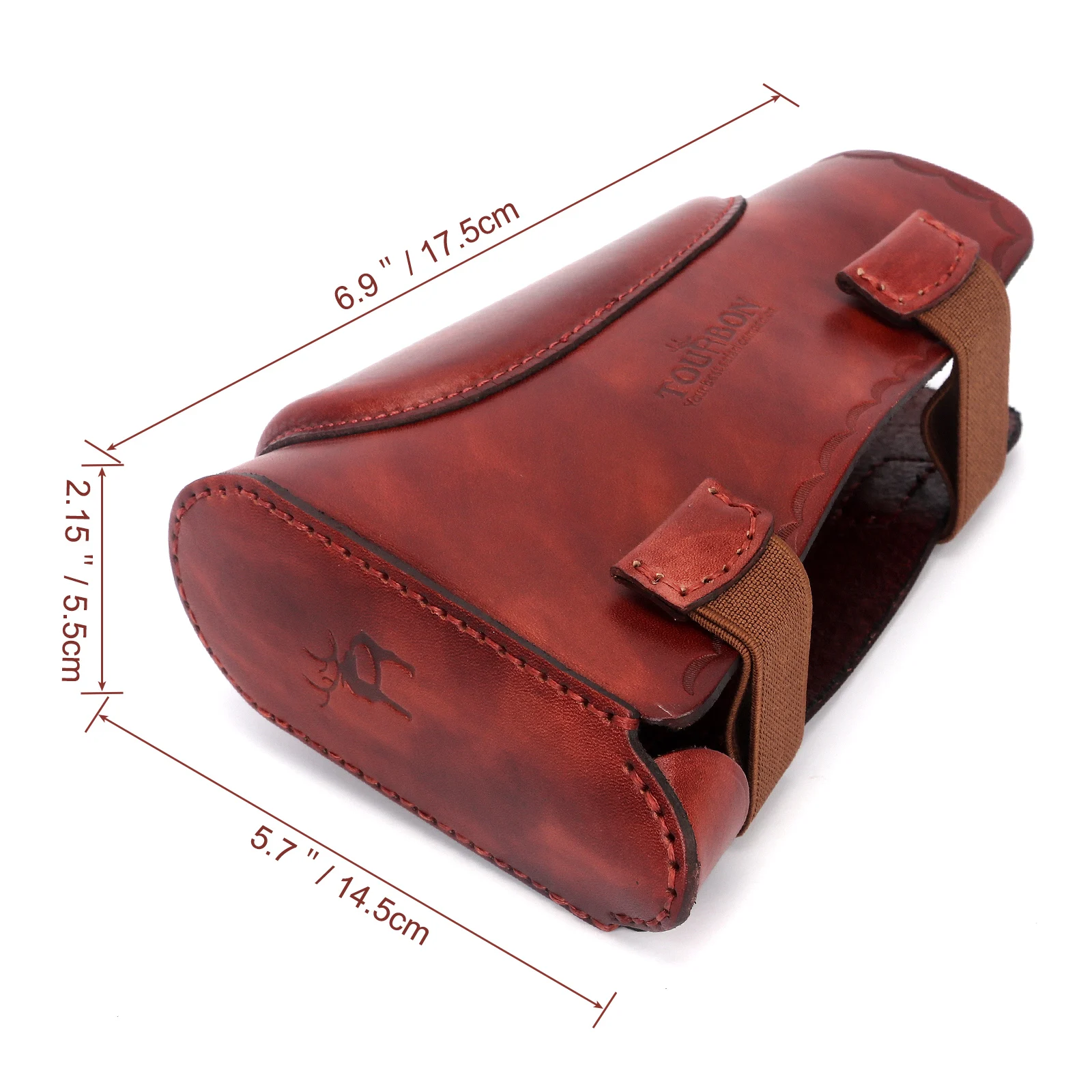 -Изготовлен из высококачественной натуральной кожи-Универсальный дизайн для стрелок с правой и левой рукой-Поставляется со съемной Неопреновая подкладка, может также использоваться в качестве отдачи-Крепкий стояк для щек сохранит вашу голову там, где она должна быть.-2 эластичных ремня, чтобы они подходили к большинству запасов пистолета, подходят для пистолета на пуговицах до13,5 см-Дополнительный кожаный держатель на открывающейся стороне, чтобы избежать выскальзывания пистолетов
