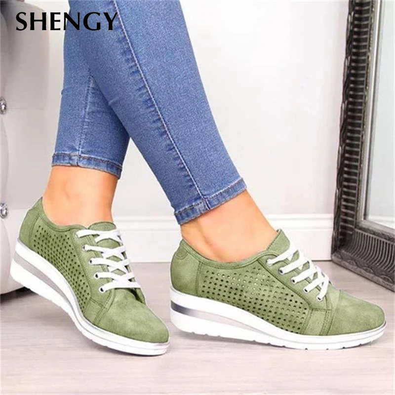 Женские холщовые кроссовки на танкетке, Повседневные Дышащие сетчатые туфли-лодочки на платформе, лето-осень 2019