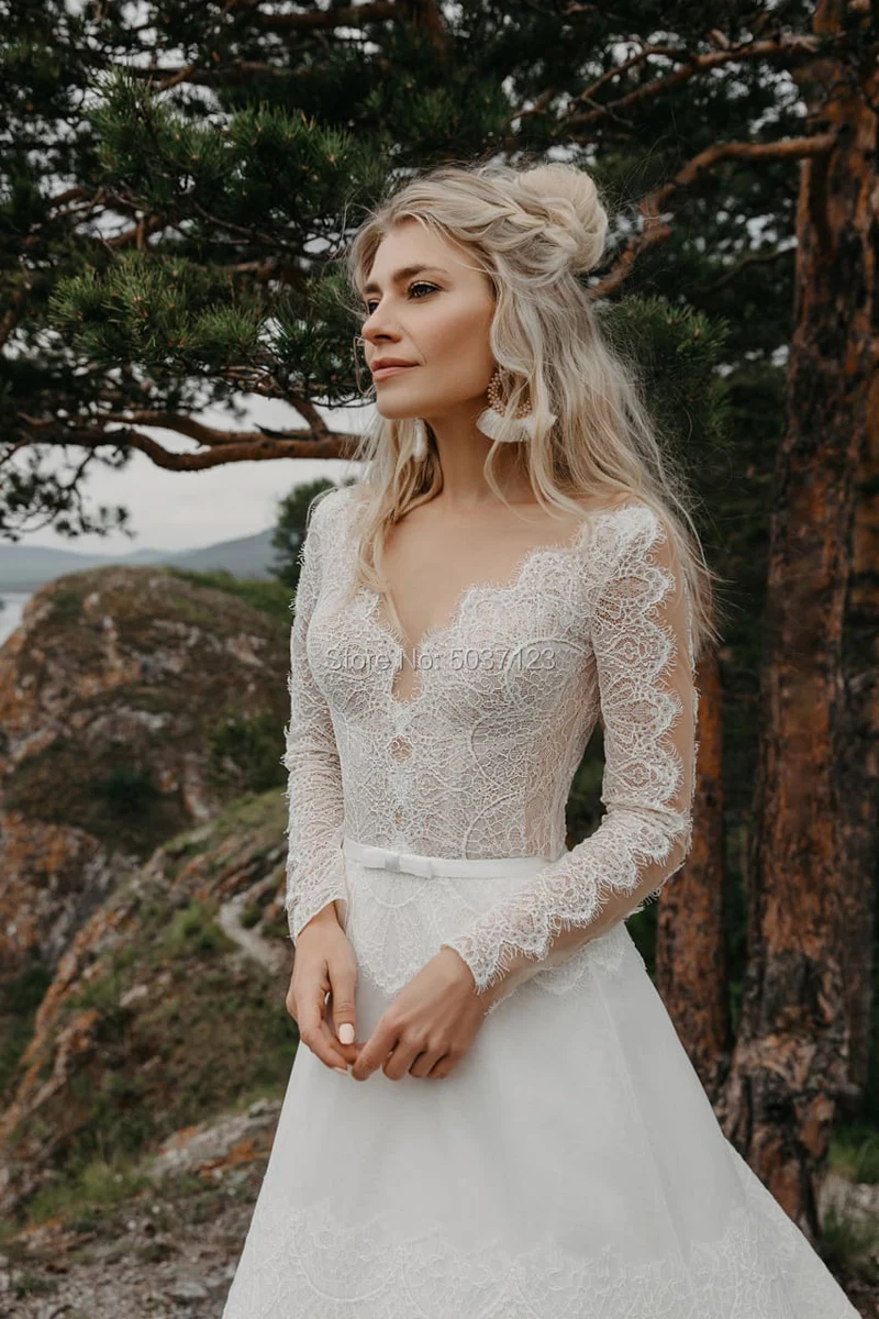 Богемные Свадебные платья трапециевидной формы с v-образным вырезом и длинными рукавами Vestido De Noiva winsome кружевные мягкие тюлевые Прозрачные Свадебные платья с пуговицами на спине