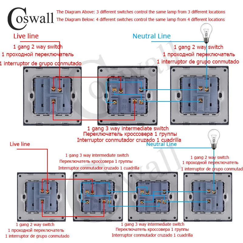 Панель из нержавеющей стали Coswall, 1-канальный 3-ходовой промежуточный переключатель, переключатель кроссовера ВКЛ.ВЫКЛ., настенный выключатель света, серия 16A X2