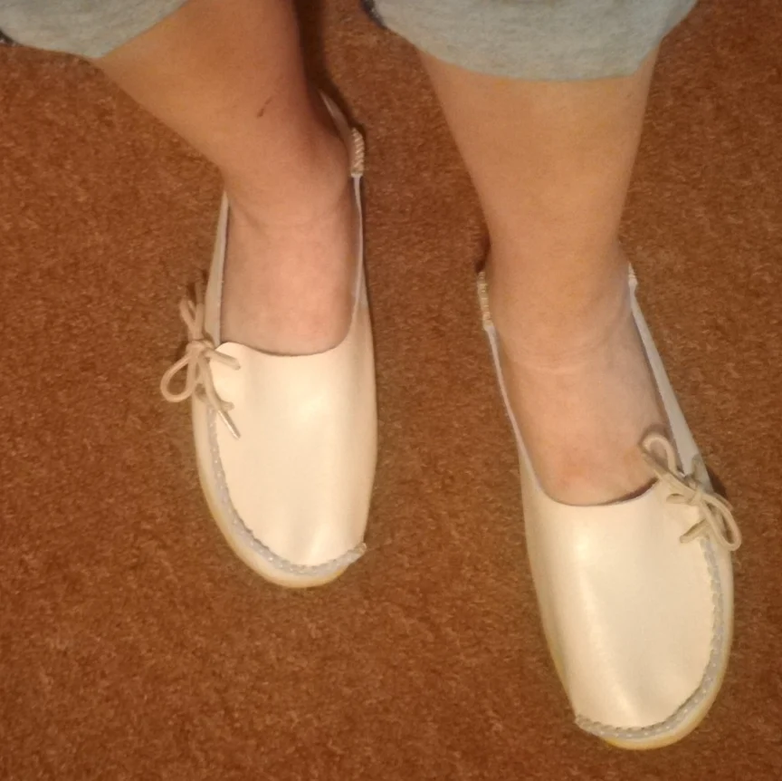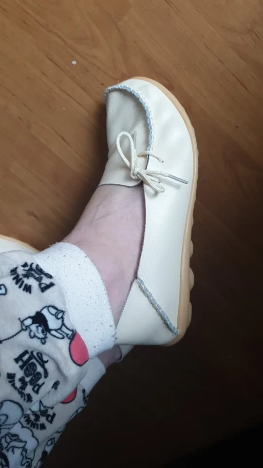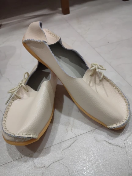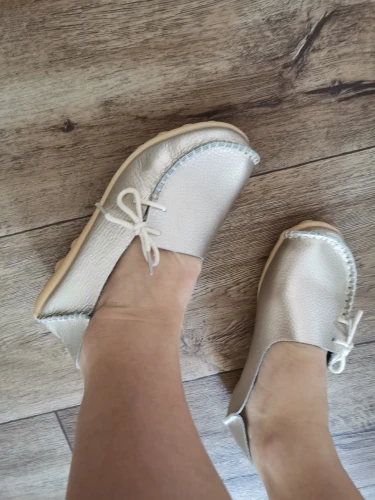 Белые немного разочаровали. Если в бежевых все идеально, то у белых есть проблема: кожа разная. На одном мокасине мягкая, на другом жесткая. Это, конечно не критично, не неприятно... Наверное, перед отправкой, продавцу следует проверять обувь на наличие таких недостатков.