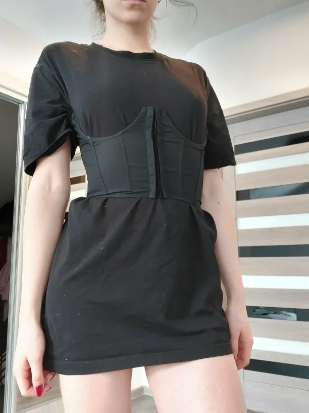 По идее носится с рубашкой,но с ней в жизни выглядит довольно странно. Заказывала размер s,моя талия +-65,грудь +-90,подошло хорошо,в самый раз,но на толстом слое одежды,уже не застегнется(ну или если обожрусь). ткань немного прослеживается,косточки все хорошие,прекрасно поддерживают форму.