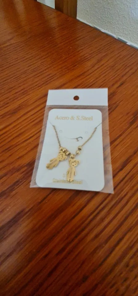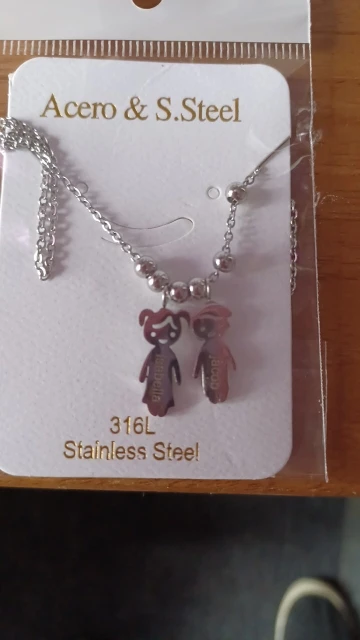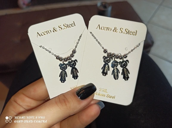 muy lindo llegó con los nombres de mis hijas. cadena color opaco le podré esmalte de uñas al dije para que no cambie de color.
