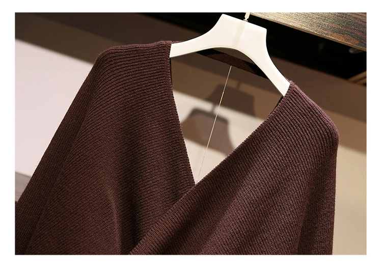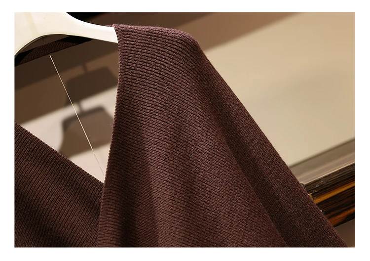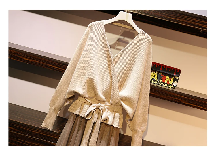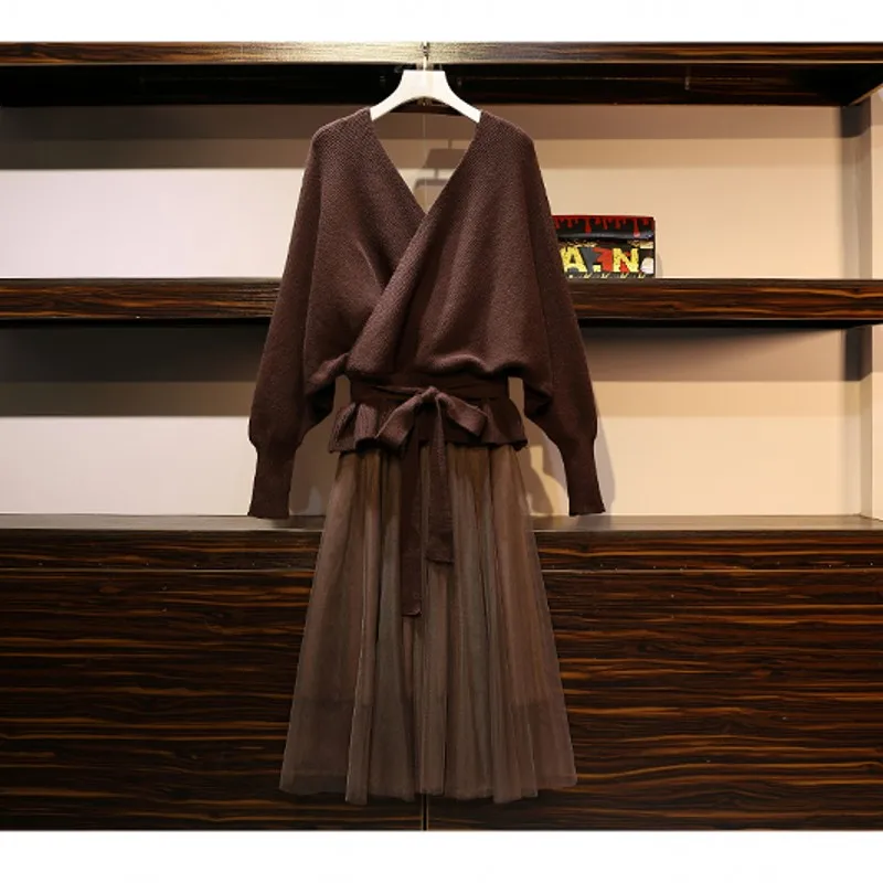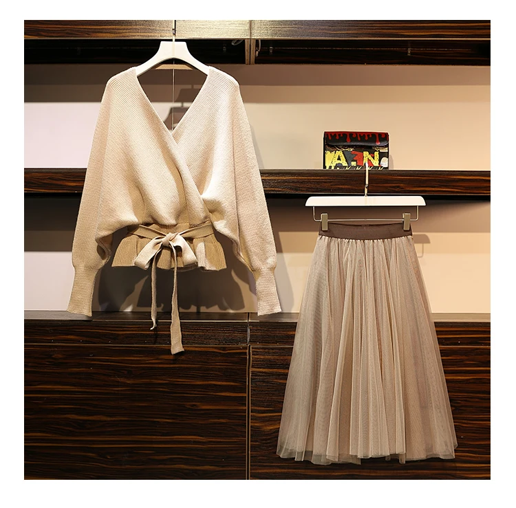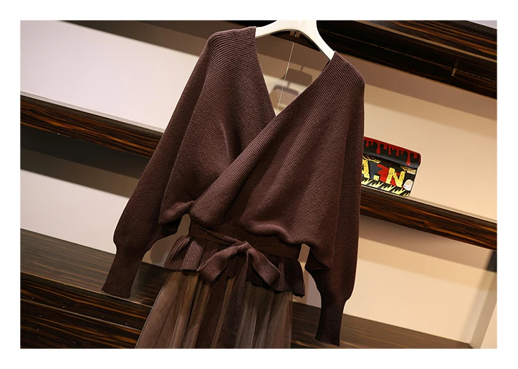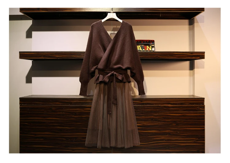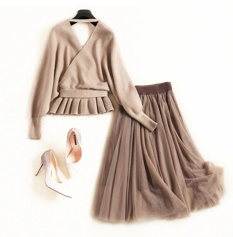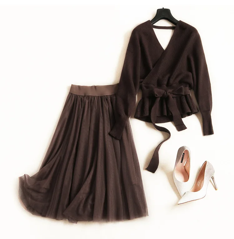 Женское кимоно с V-образным вырезом, вязаный свитер, пуловеры с открытой спиной, сетчатая юбка-пачка, костюмы, осенне-зимний комплект из двух предметов, новинка 2019, коричневый