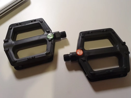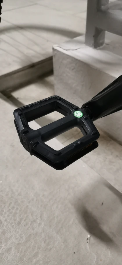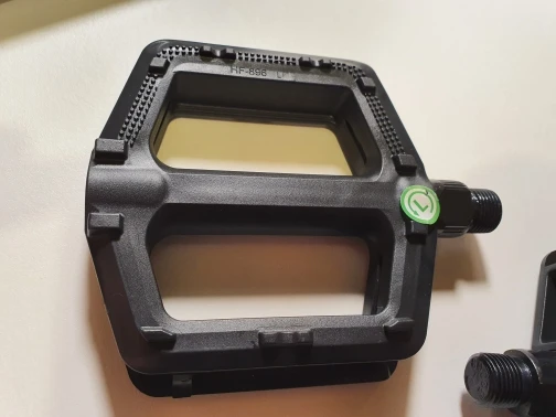 Внутри не видно подшипников, стальная ось с резьбой с одной стороны с другой стороны расклёпана на шайбу внутри пластиковой педали. Вращаются педали неравномерно, рывками и с разным усилием. Пластиковая педаль отлита очень качественно, выглядят очень хорошо. Может ещё приработаются.