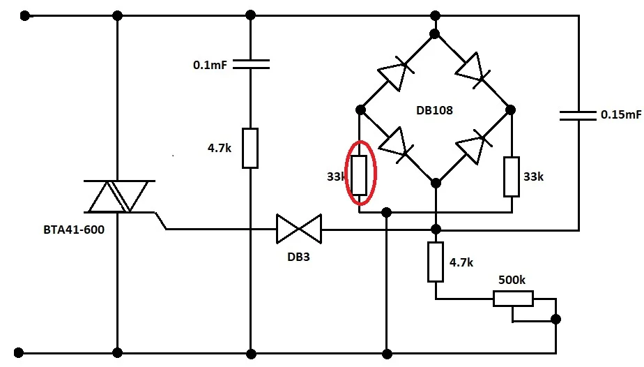 При включении через минуту пошел дым. Оказалось подгорел резистор подсоединенный к "+" моста. Прозвонил, пока не сгорел полностью, сопротивление 4.7 КОм, нашел в Интернете схему - 33КОм. Второй резистор подключенный к "-" моста номинал правильный 33КОм. Прикинул мощность рассеивания при 4.7 КОм - 10 Ватт, при номинале 33КОм - 1.5 Ватта (резисторы 2 Ваттные). На фото кружками показан подгоревший резистор. Веду переписку с продавцом о возврате части денег. Продавец предложил вернуть диммер, а в замен выслать другой, но для меня это не вариант, пересылка туда-сюда еще 3 месяца, да мороки много. Проще заменить резистор. Может продавец и не очень виноват, претензии больше к изготовителю, но это явный брак.