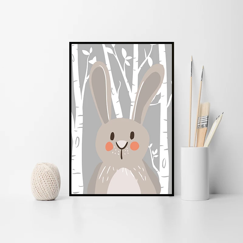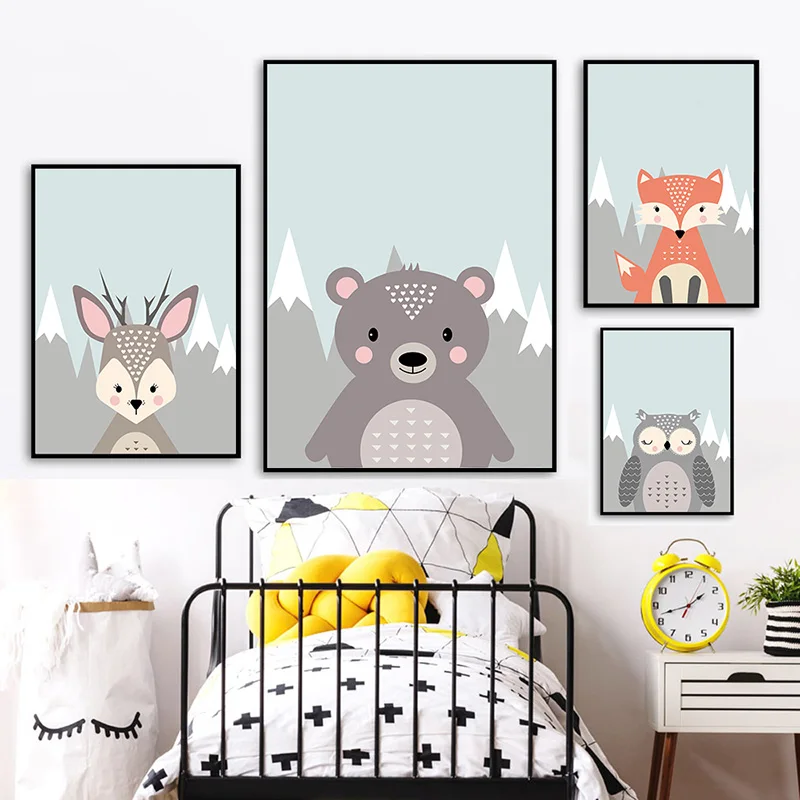 Картина на холсте с изображением лесных животных, медведя, кролика, лисы, для детской спальни
