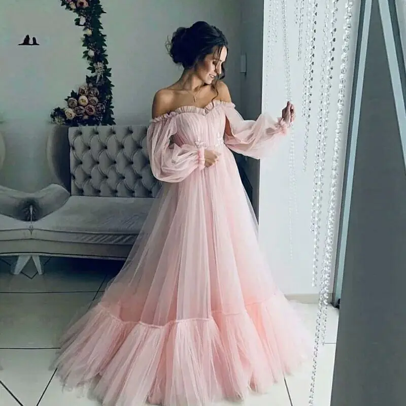 Женское вечернее платье, розовое платье из мягкого фатина с длинным рукавом, для выпускного вечера