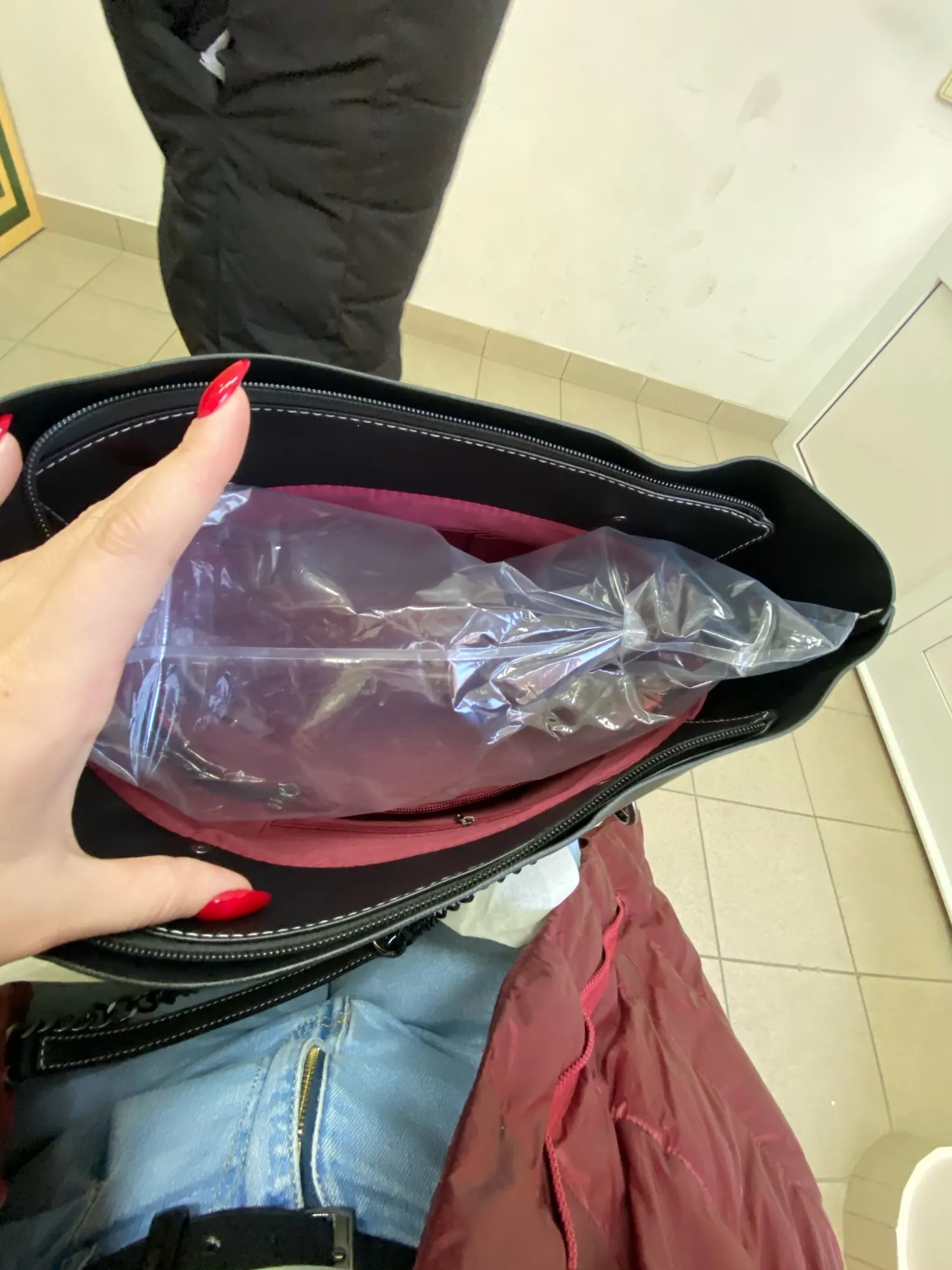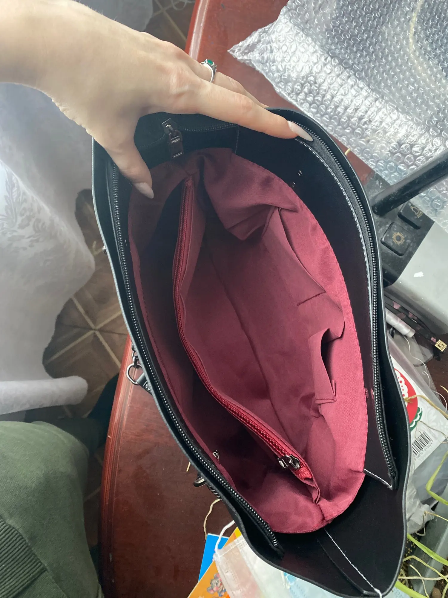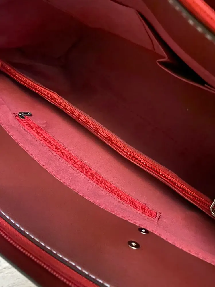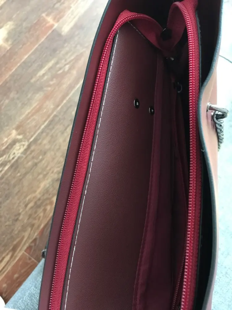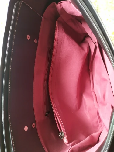 Сумка отличная. Кожзам очень плотный и качественный. Все строчки ровные, фурнитура добротная. Внутреннее отделение закрывается на замок. Выглядит очень стильно сочетание бордовой подкладки с чёрным материалом сумки. В Москву пришла за 2 недели. Сумку рекомендую !!! Отличный товар