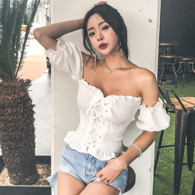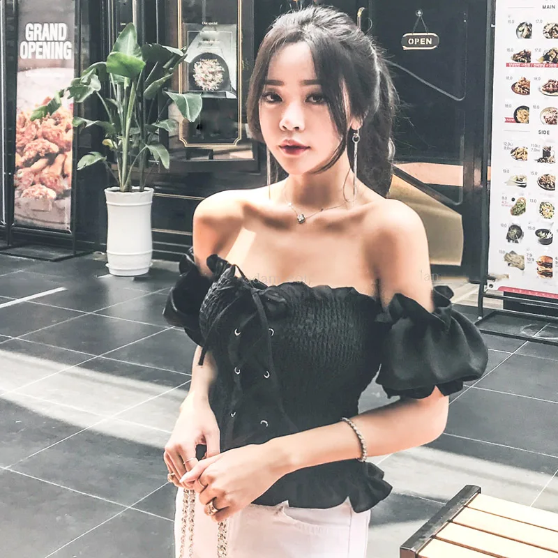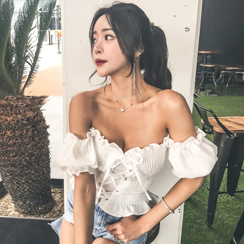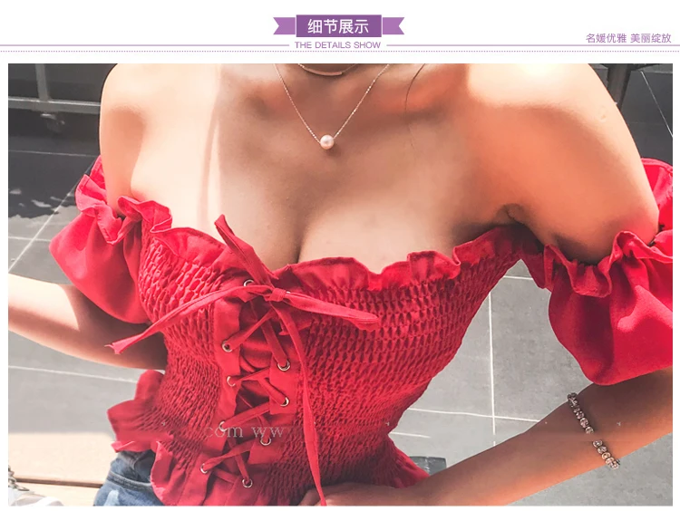 Блузка JSXDHK женская с открытыми плечами, пикантная кружевная блузка с рукавами-фонариками, топ в стиле бохо, эластичная пляжная рубашка, лето 2019