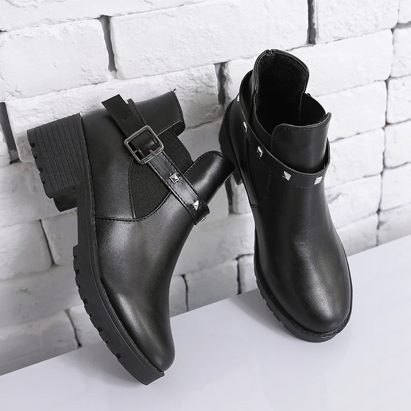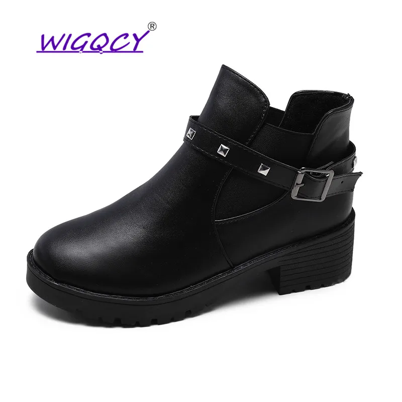 Женские зимние ботинки из искусственной кожи, с заклепками, на каблуке, с теплой меховой плюшевой стелькой, ботильоны, женская обувь с ремешком с пряжкой, 2019