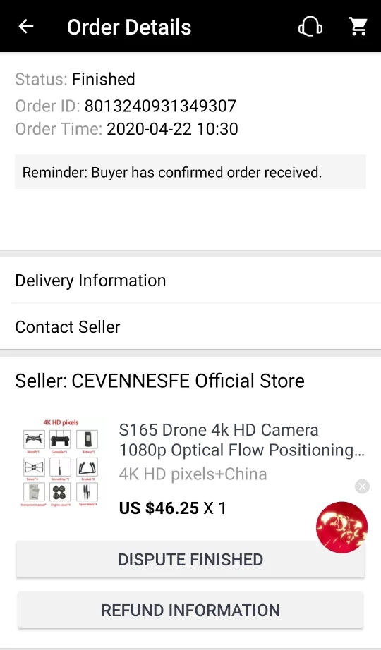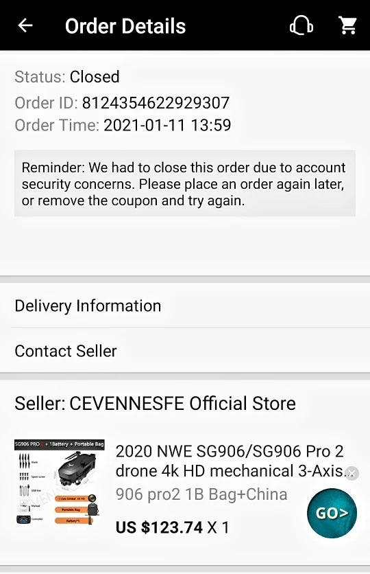 Я заказал в течение 7 часов, и продавец не отправил посылку с дронами, я подождите 30 дней, пока мои деньги будут возвращены с aliexpress, я заблокировал деньги В aliexpress, если бы я понял, что это была ложью, мы бы купили у другого продавца, Дрон пришел с дефектом, и я не мог, что он может быть Рассеиватель