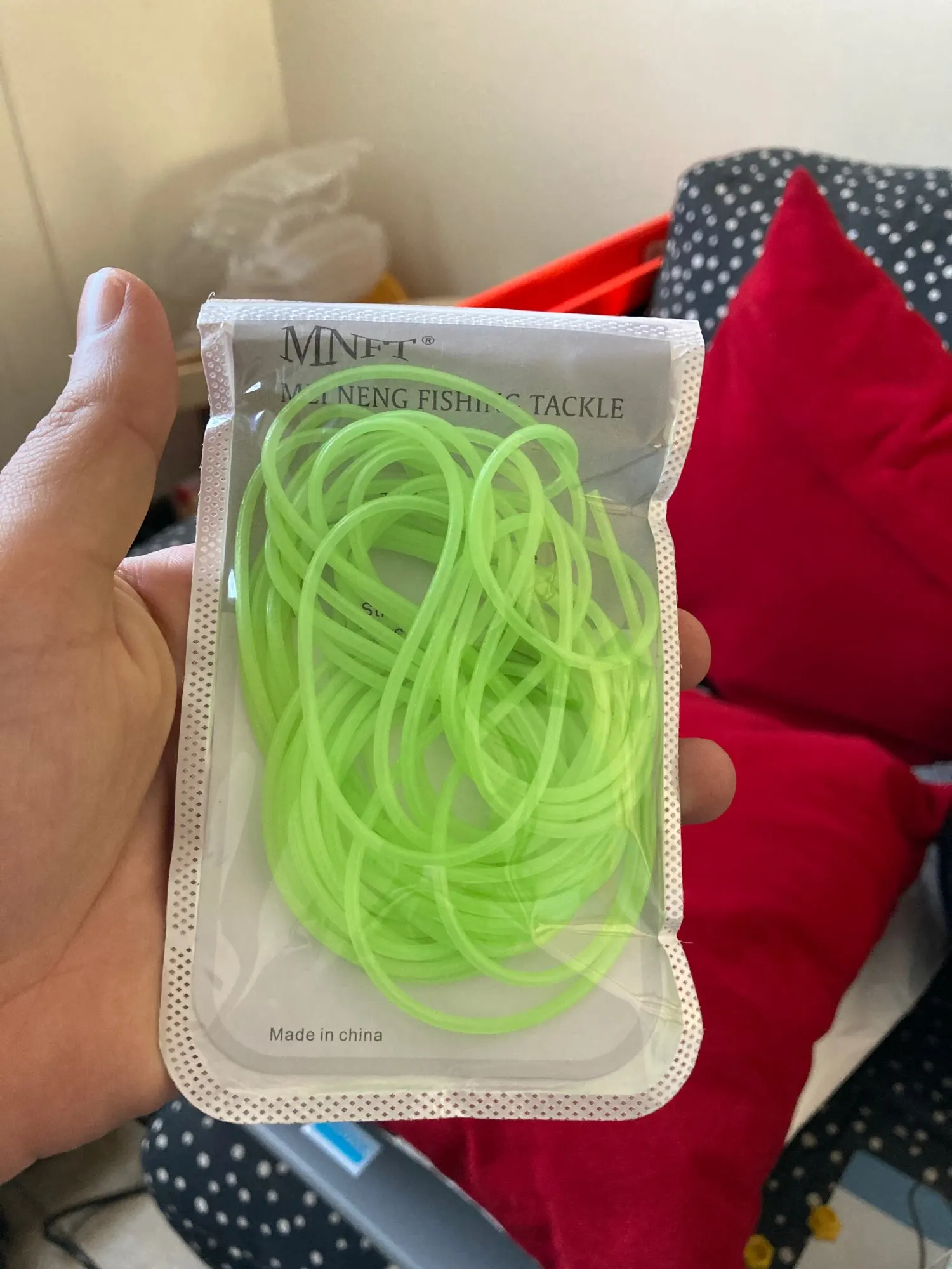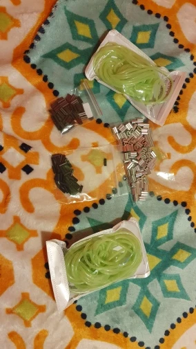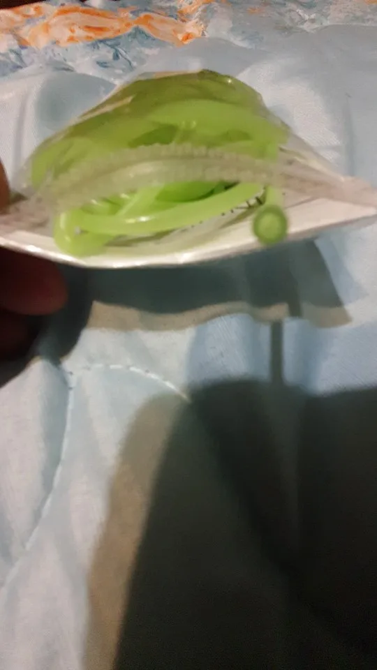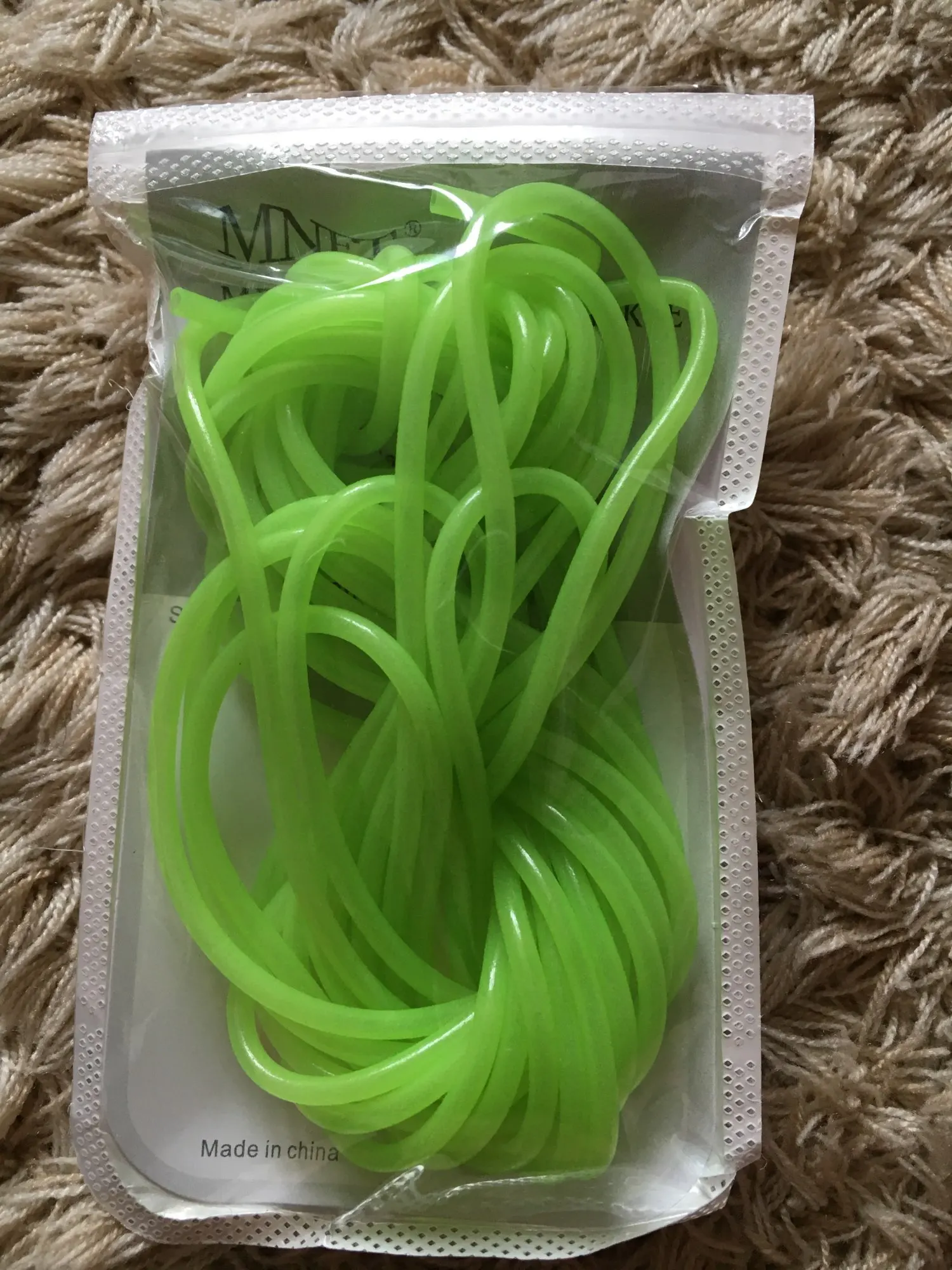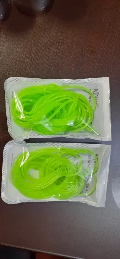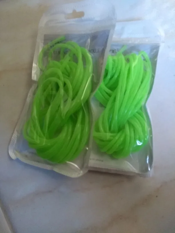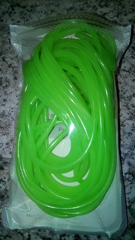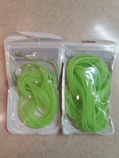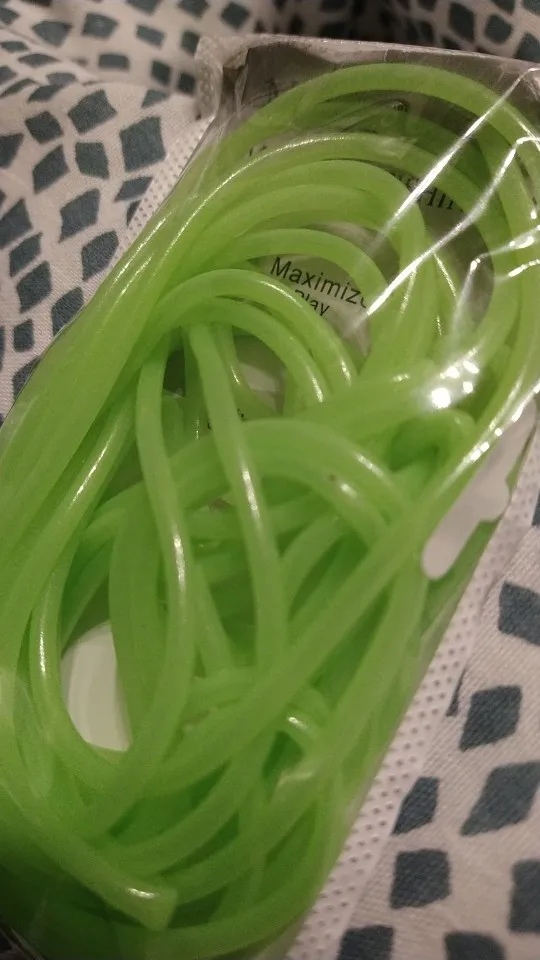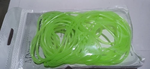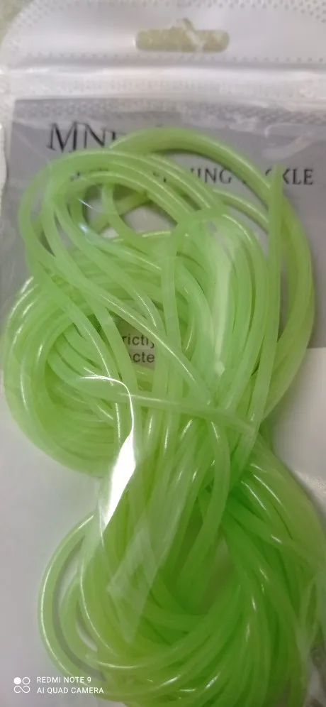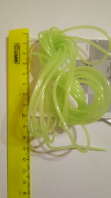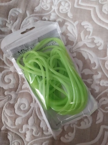 Не такая яркая трубочка,как на картинке, более бледная. Трошки светится в темноте. Совсем не тянется, я почему-то подумала, что она резиновая....нет, тонкая пластмасса, гнется легко, вроде не ломается. Не знаю, куда буду девать, мне нужна была яркая эластичная резинка.