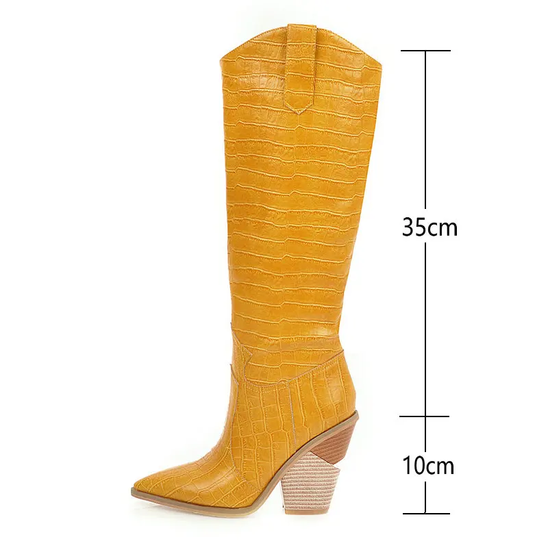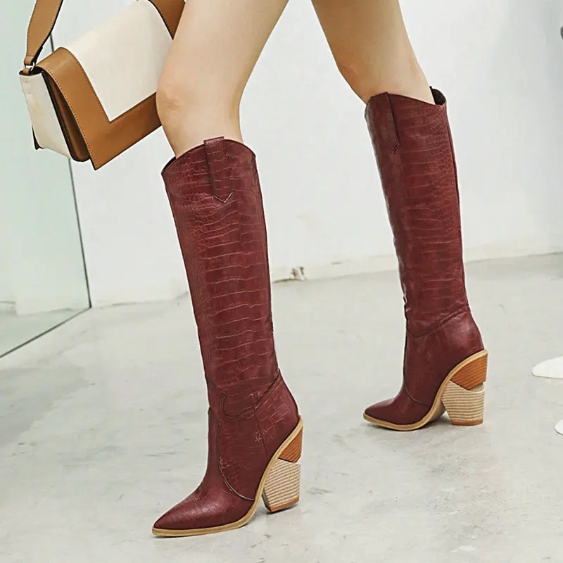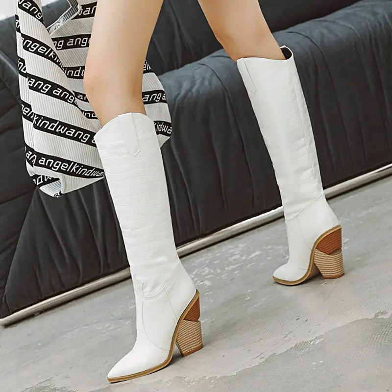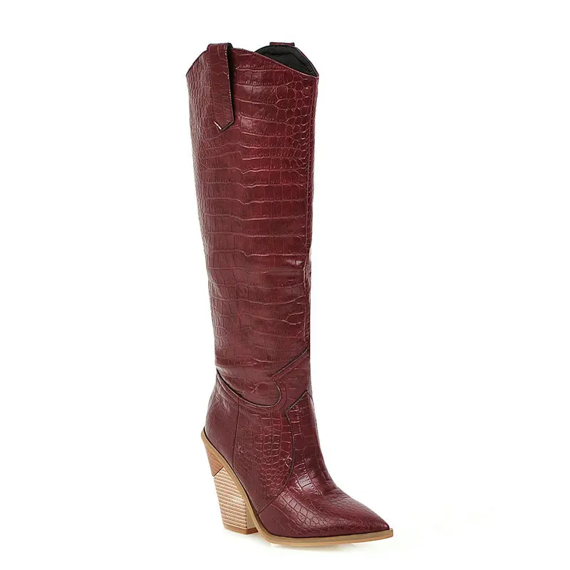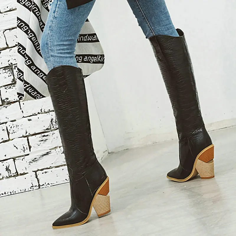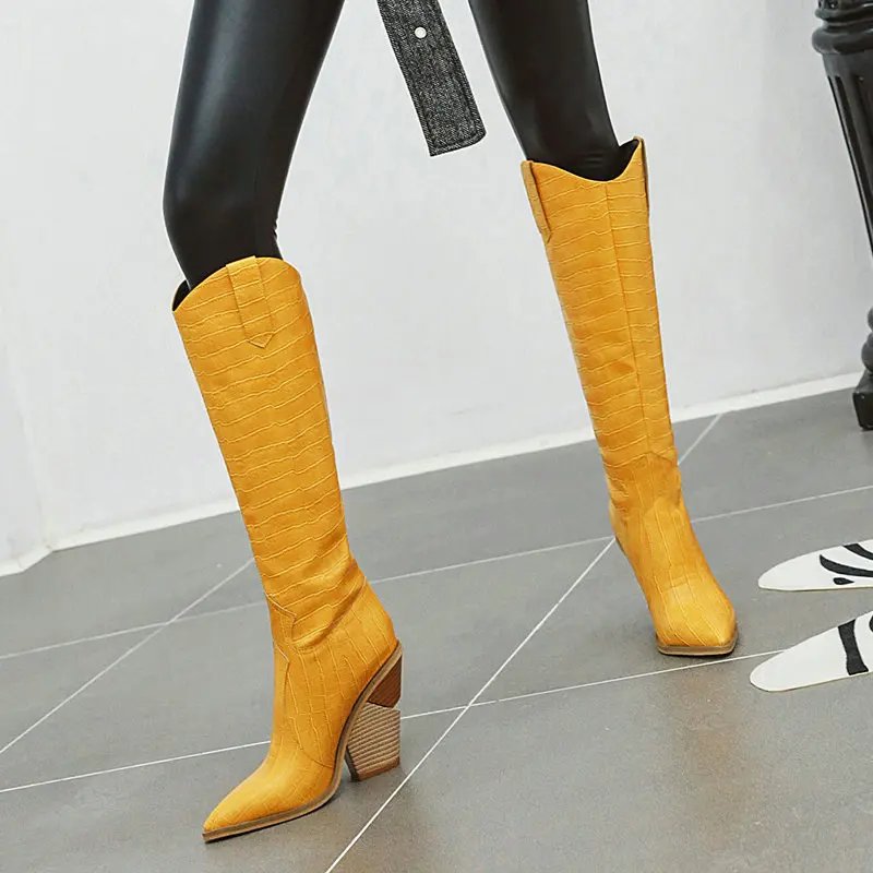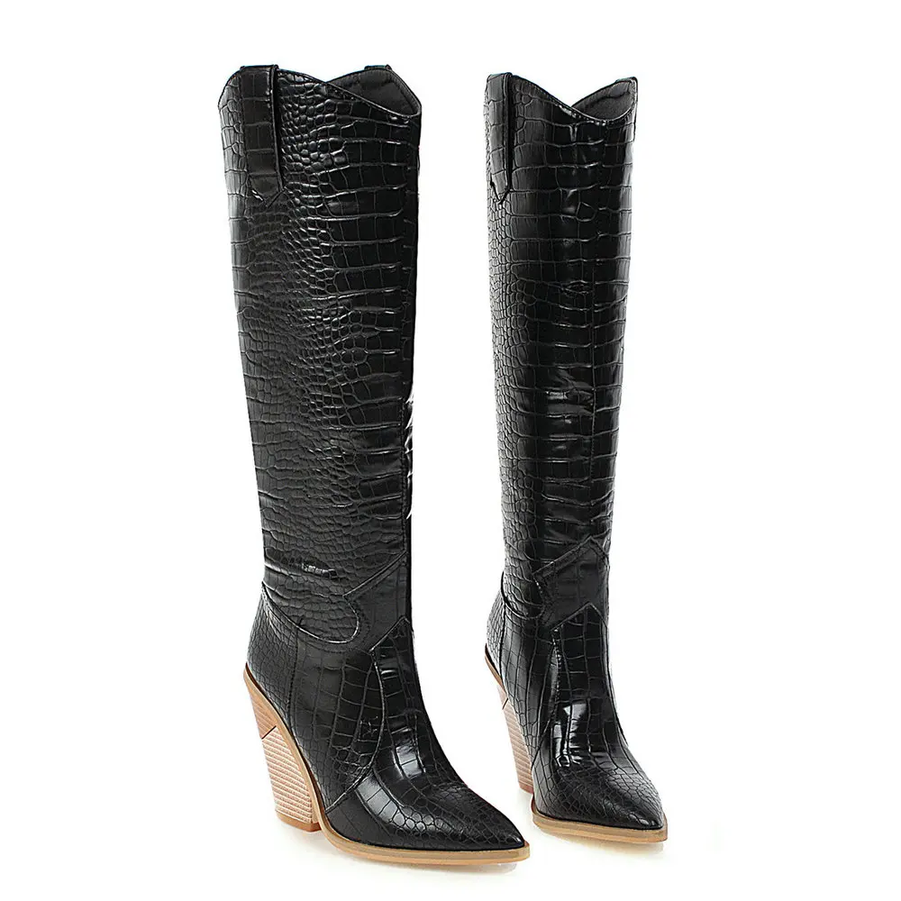 Женские сапоги до колена из искусственной кожи, сапоги на танкетке в западном стиле, высокие сапоги с острым носком на высоком каблуке, осенне-зимние сапоги из коровьей кожи, 2019