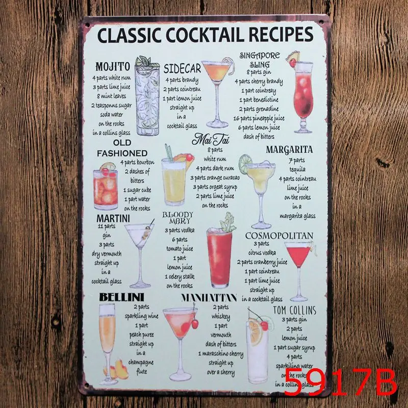 Классические Коктейльные рецепты винтажные жестяные знаки Ретро металлическая пластина картина Классическая железная картина настенное украшение для бара паба кафе