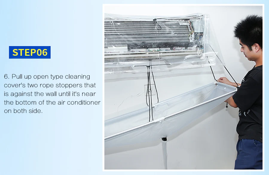 5. Вставьте большой размер прозрачной пленки в заднюю часть кондиционера и затяните чистящую крышку, отрегулирув стоппер для троса.